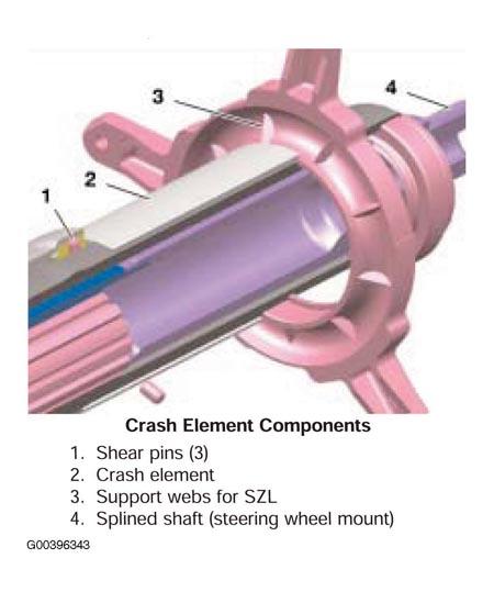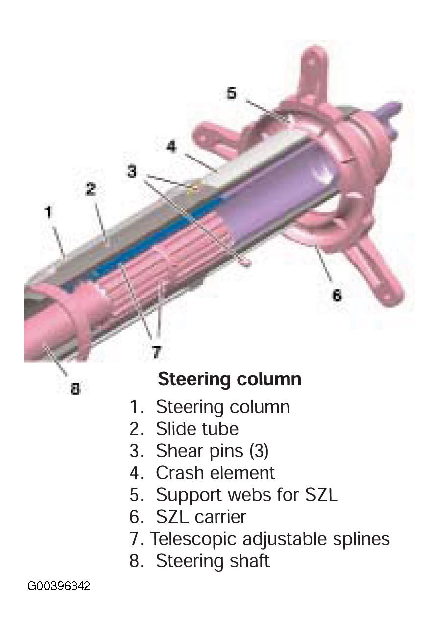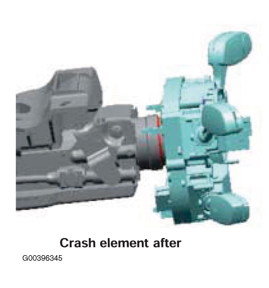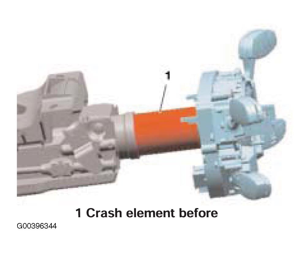 The upper steering column with crash element can be compressed telescopically by 70 mm when the steering column is subject to load in the event of a crash. This telescopic action is controlled by a crash element made of fiber glass reinforced plastic. See Fig 1