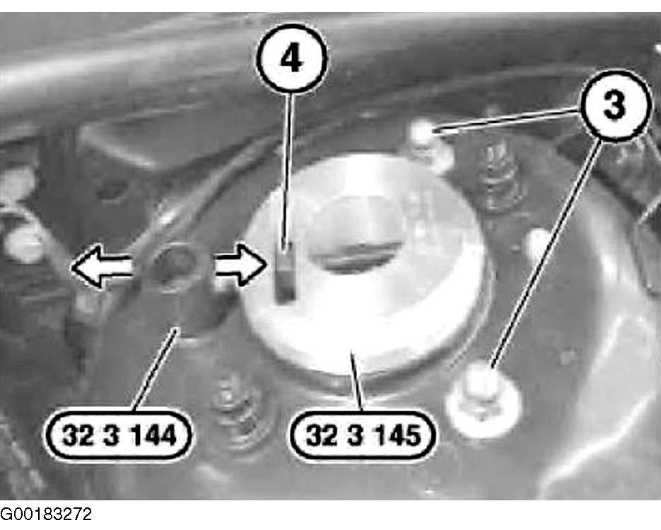 - Insert special tool (32 3 144/145) into opening of wheel arch and over nut. Replace nuts (3) and screw on but do not tighten down fully. Adjust camber by turning nut (4) in special tool. See Fig 2 .