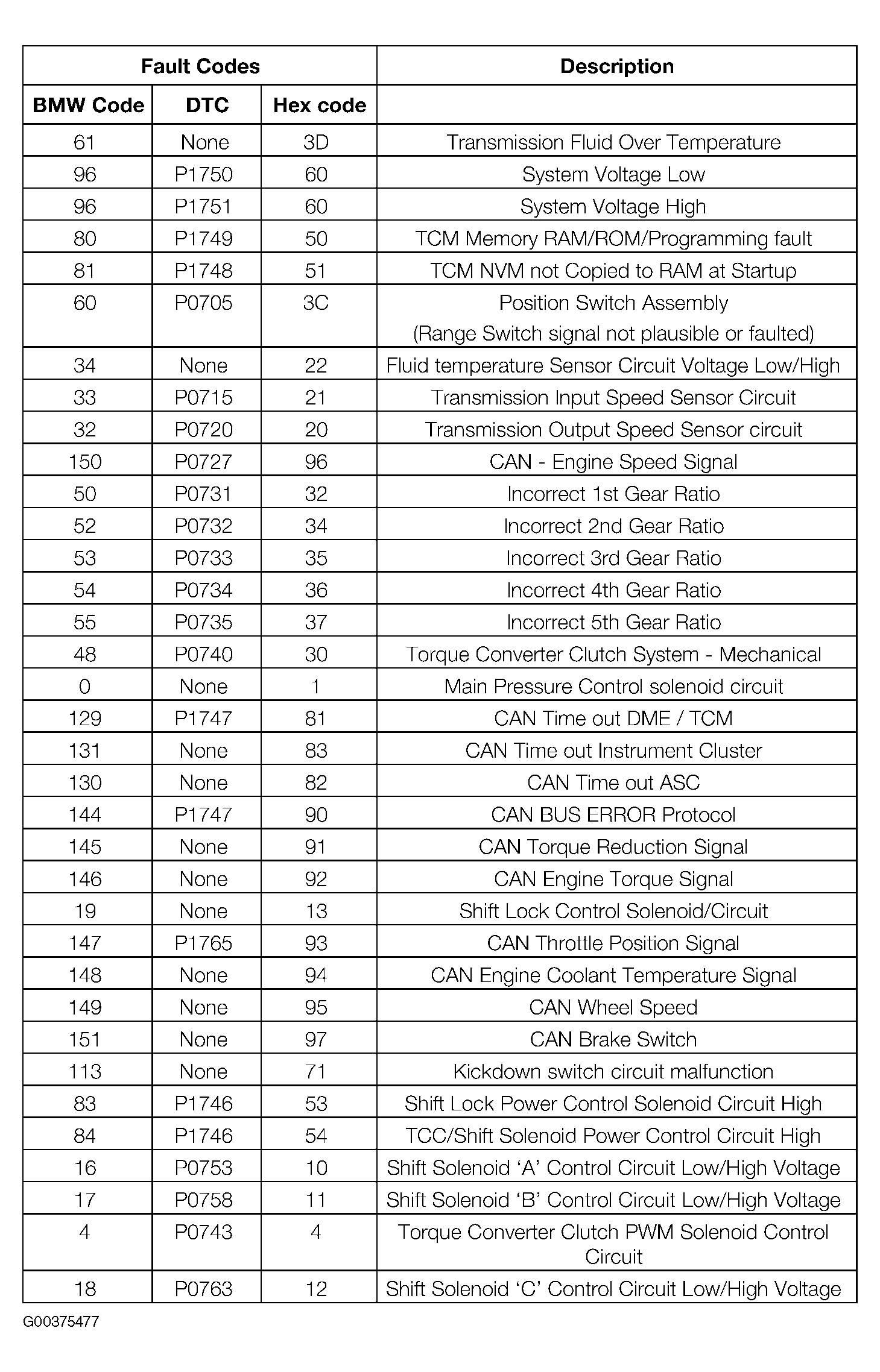 The E46 diagnostic concept provides an minimization of fault symptom selections based on areas of selection. Follow the test schedule provided by the DIS/MoDiC. The test schedule is based on the selected fault symptom and stored fault codes. The GS 20 monitors the A5S 360R and interfacing systems. When faults are detected, the GS 20 stores the following fault codes. See Fig 1 .