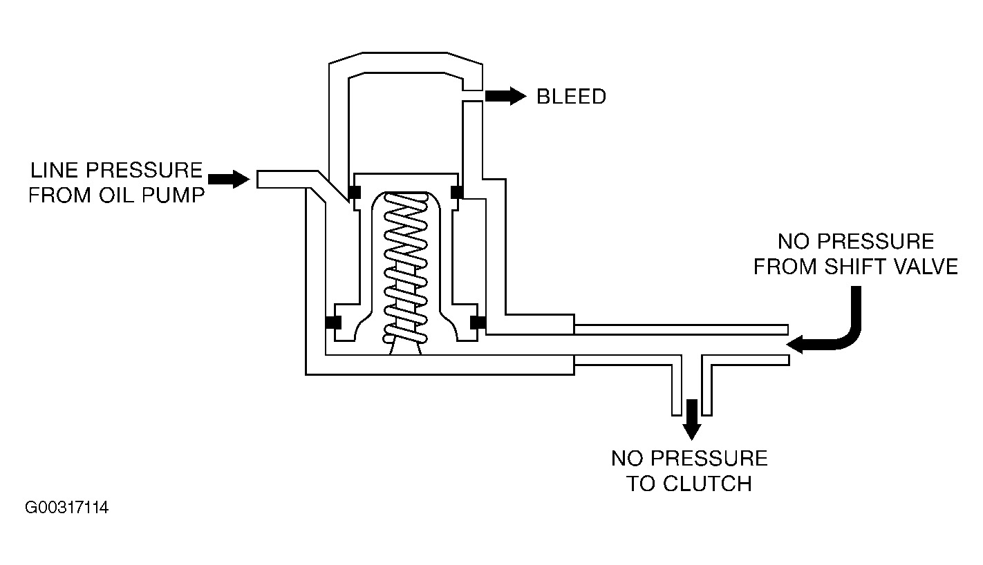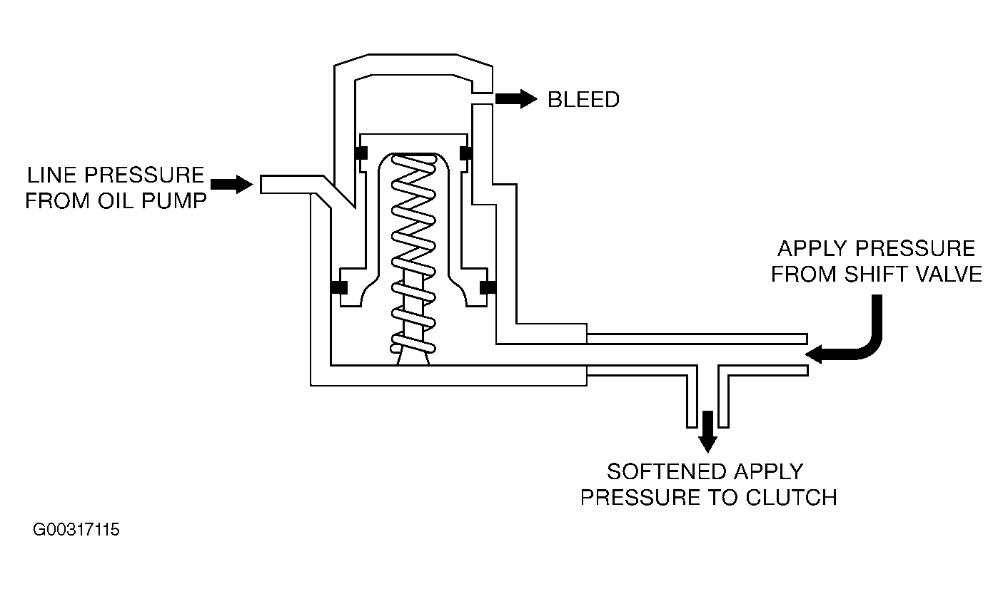 Clutch applied fluid pressure directed to an accumulator piston and helped by a spring force opposes an accumulator fluid line pressure creating an action similar to a shock absorber. The apply pressure pushes the clutch piston against the steel/friction plates causing initial engagement. Once the clearance between the clutch plates is taken up by the piston travel and the plates begin complete engagement the fluid pressure builds very rapidly. The accumulator is connected to the clutch apply circuit which at this point starts to absorb the rapidly building pressure. The accumulator piston moves upward accommodating the high pressure fluid causing a delayed complete engagement. See Fig 2 and Fig 3 .