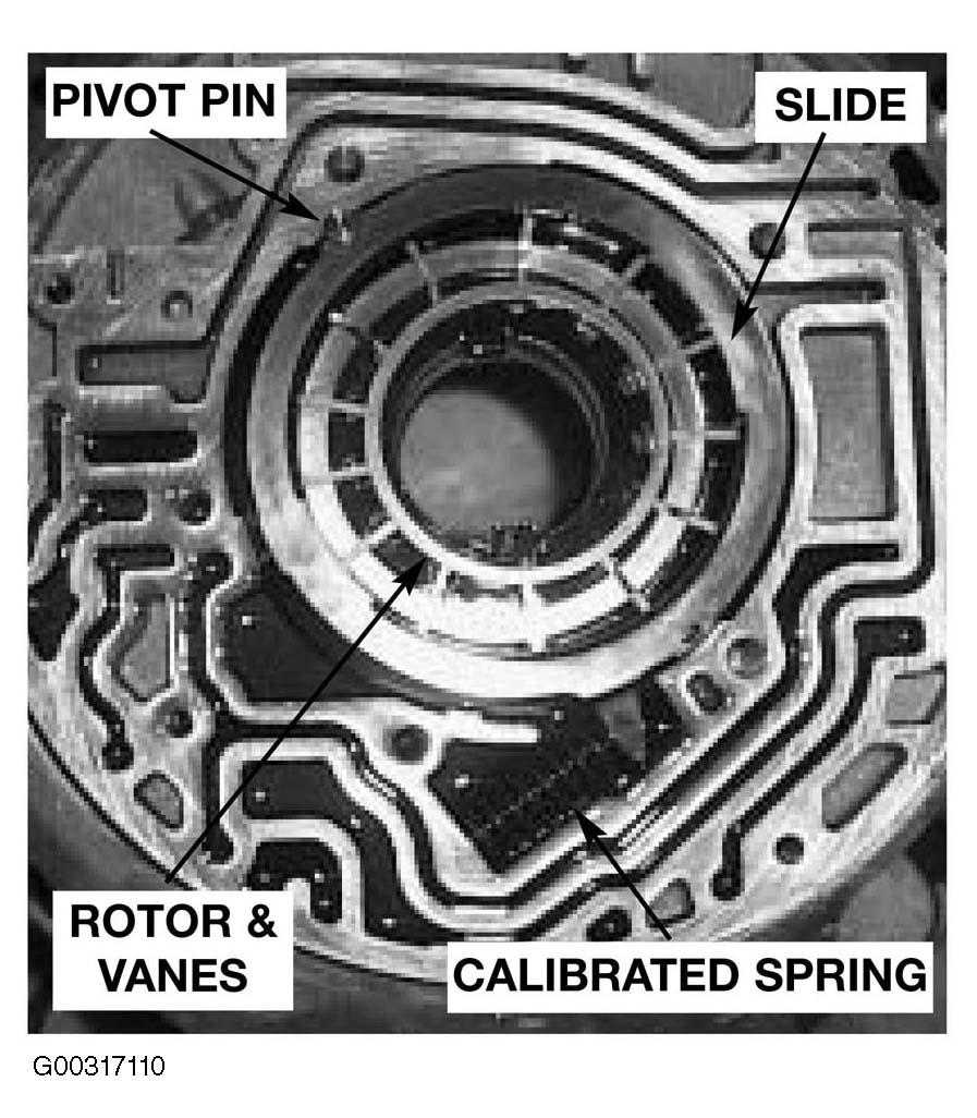 The A5S 360R uses a vane pump to provide the transmission main line oil supply for operation and cooling requirements. See Fig 1 . The pump rotor is mechanically driven by the torque converter oil pump drive tangs at 1:1 engine speed rotation providing pump operation. The rotor with 13 vanes is located in a recess on the rear surface of the bell housing covered by the pump cover plate. The rotor and vanes are placed inside a slide mechanism. As the rotor spins, the vanes "sweep" the oil from the pump intake to the output along the mating surface of the vane ends and the interior surface of the slide. The slide is mounted on a pivot pin. As it pivots, it changes the eccentricity of the rotor to slide mating surface changing the pump output volume. The slide's position is influenced by a calibrated spring and hydraulic input pressure from the main pressure regulator solenoid in the valve body. The benefit of changing the slide position is to optimize pump output volume to meet the needs of the operating conditions. See Fig 2 .