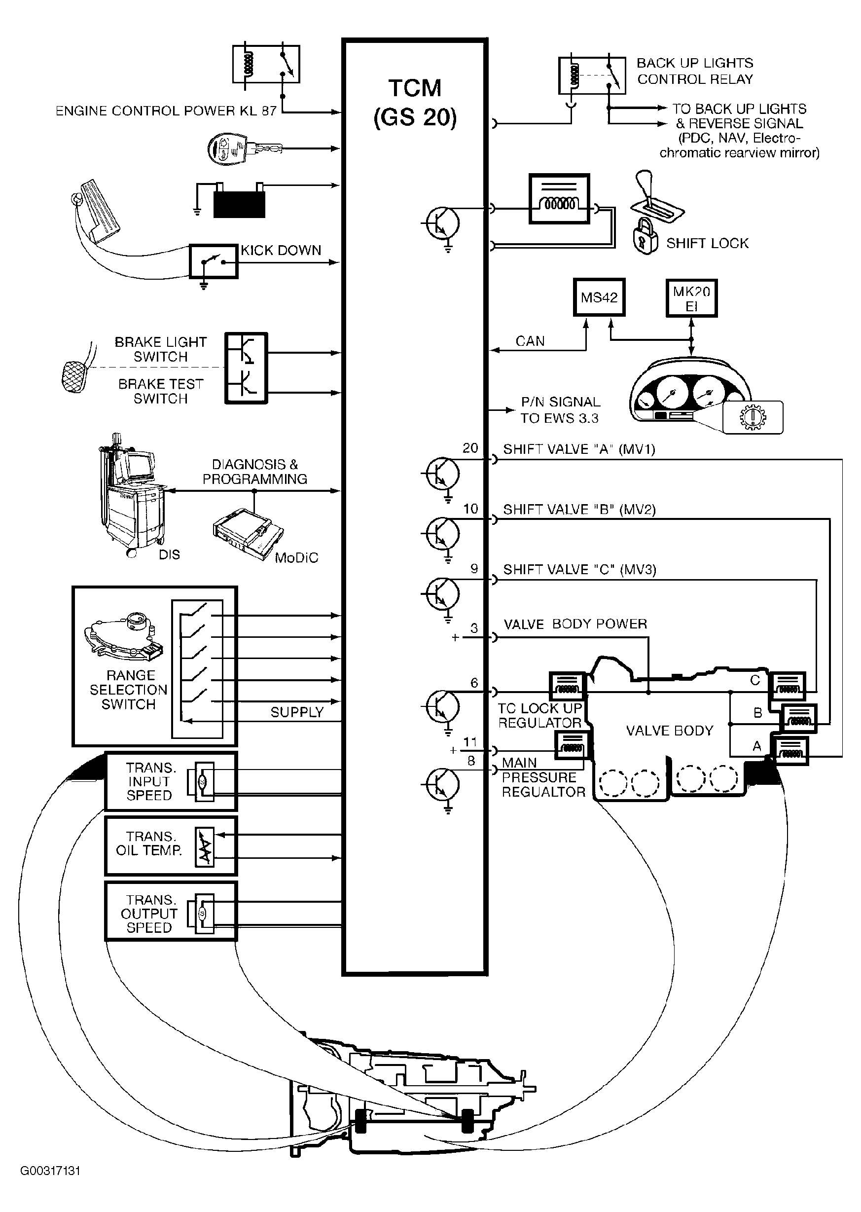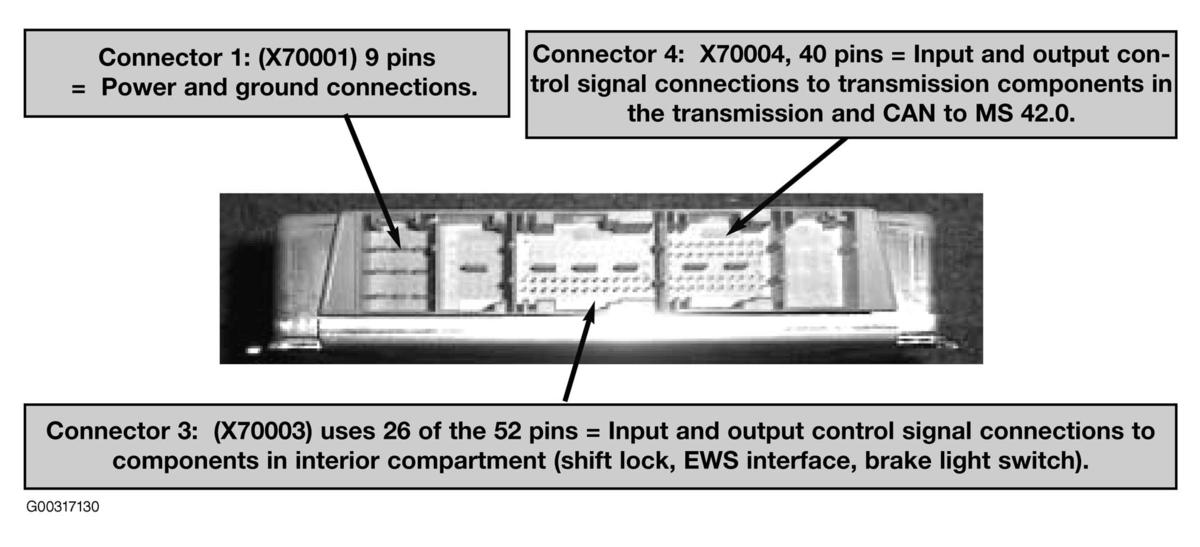 System is controlled by the GS 20 control module. The acronym (GS) comes from the German word "Getriebesteurung", meaning Gearbox Control. The design, program development and manufacturing of the GS 20 control system is the result of the combined efforts of BMW, Siemens and GM. The GS 20 control module is located in the E box in the engine compartment. See Fig 1 . It utilizes the 134 pin, "SKE" (standard shell construction), modular connector, enclosure. See Fig 2 , Fig 3 and Fig 4 .