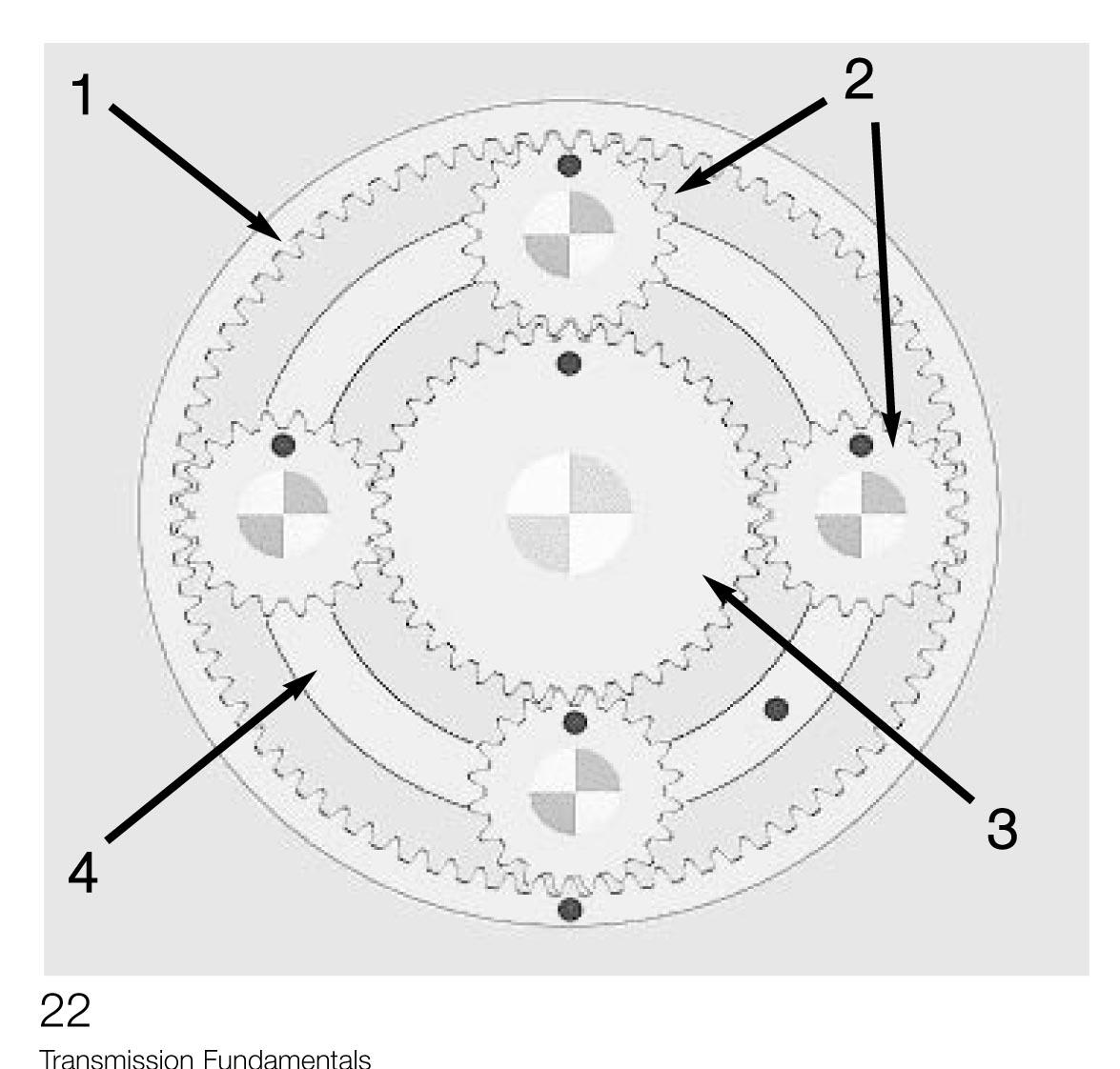 As an example of power flow in reverse gear, planetary gear carrier (4) is held stationary. The sun gear (3) is driven in a clockwise direction. The planetary pinions (2) are driven counterclockwise, which in turn drives the internal ring gear (1) counter clockwise as well. See Fig 1.