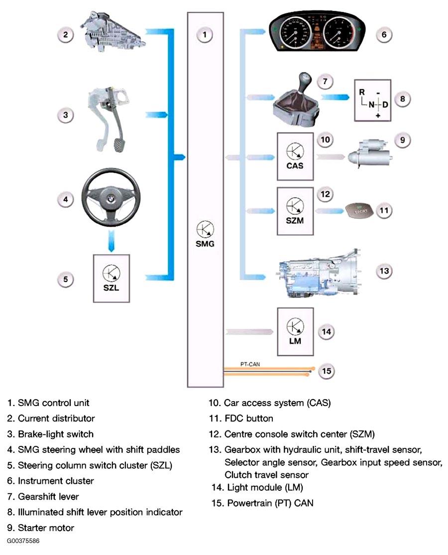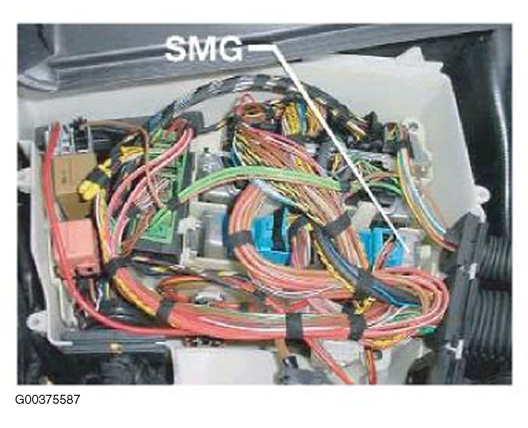 The SMG Control Module is a single-board unit with a modular connector system (SKE with 5 sockets) and is located next to the ECM in the E box. See Fig 1