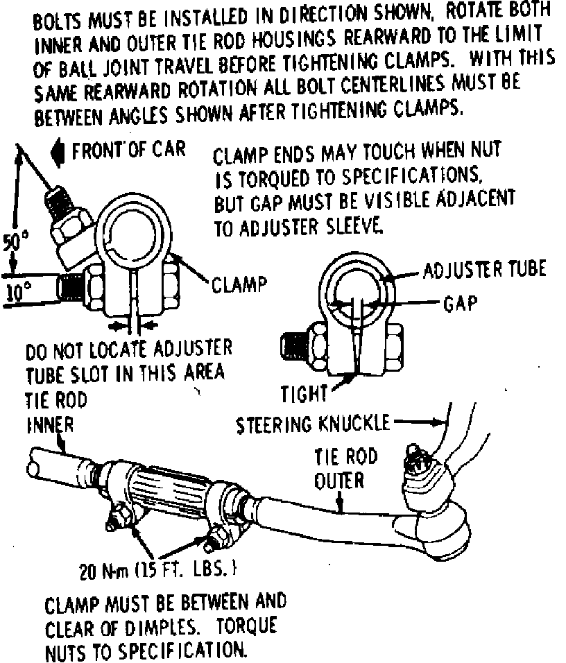 5. Ensure tie rod end housings are at right angles to the steering arm, then position and torque tie rod adjustable sleeve clamps as shown in Fig. 1.