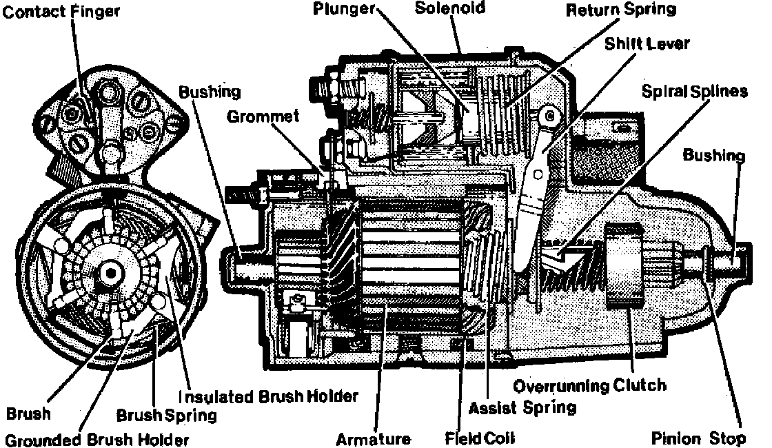 The Delco-Remy starter, Fig. 1, has the solenoid shift lever mechanism and the solenoid plunger enclosed in the drive housing to protect them from exposure to road dirt, icing conditions and splash. They have an extruded field frame and an overrunning clutch type drive. The overrunning clutch is operated by a solenoid switch mounted to a flange on the drive housing. The diesel engine starters have a center bearing.