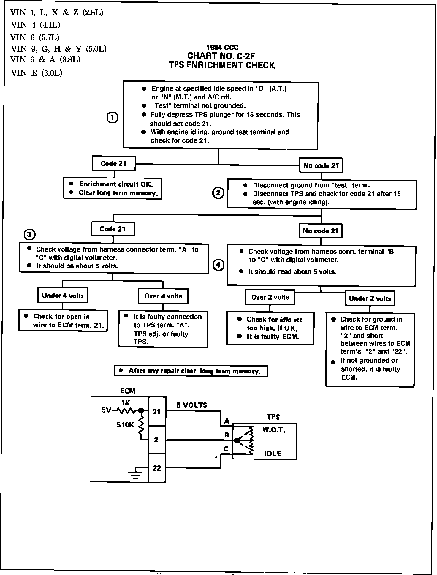 3. This step checks for 5V. ref. at TPS. It should be about 5 volts. If loss of V. Ref. were in the ECM, it should set Codes 21, 32 and 34 since this is the same 5V to MAP, BARO or Vacuum Sensors. Therefore, it must be an open in the wire.