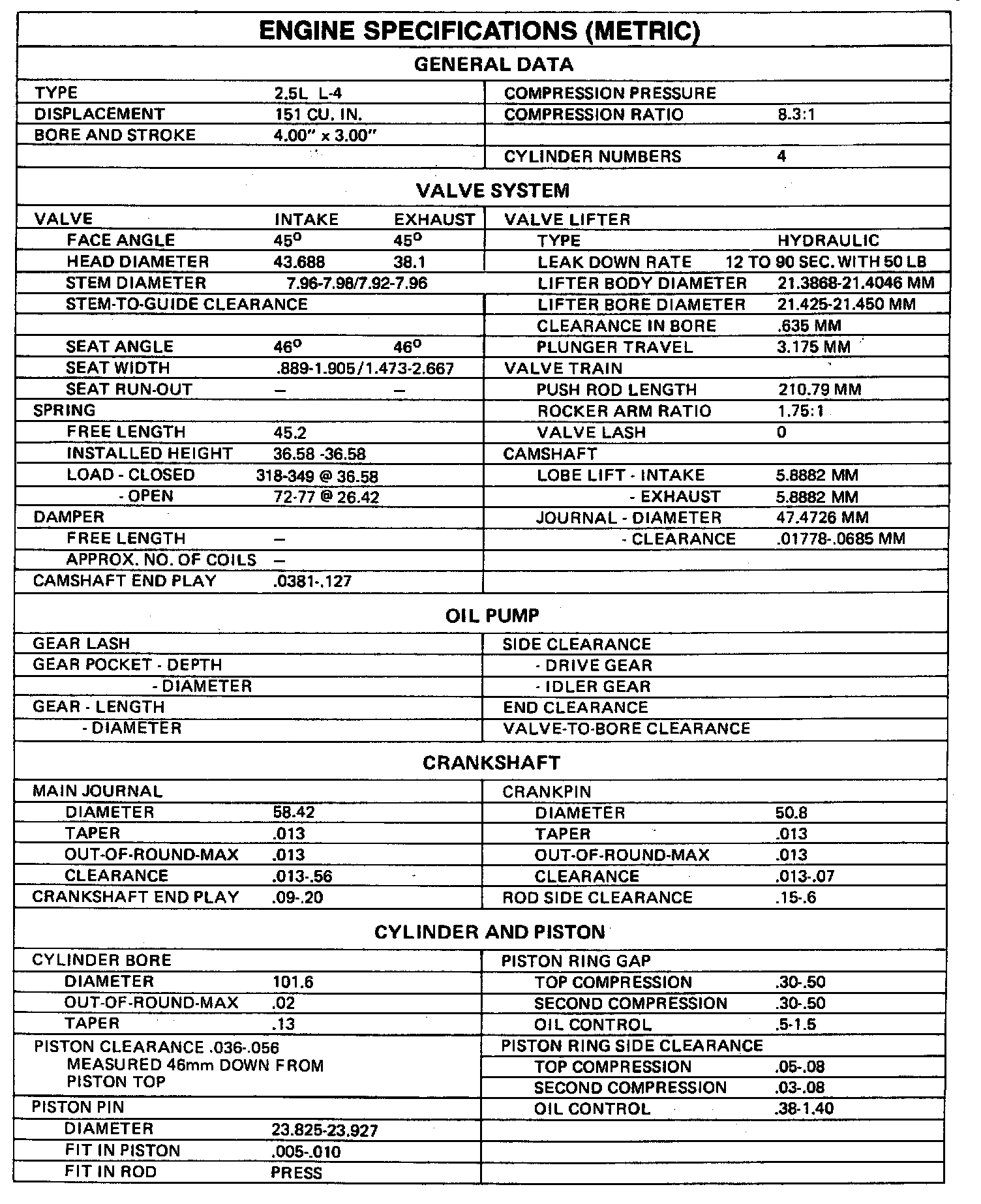 Engine Specifications (METRIC):