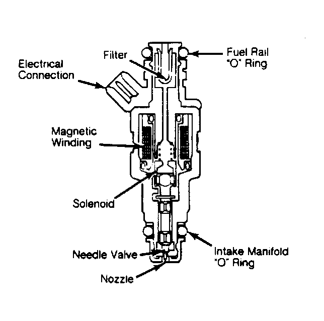 The solenoid operated port fuel injector is controlled by the ECM. The injector consists of a valve body with a specially ground nozzle valve. The moveable armature is attached to the nozzle valve. Nozzle valve is held against nozzle body sealing seat by spring pressure.