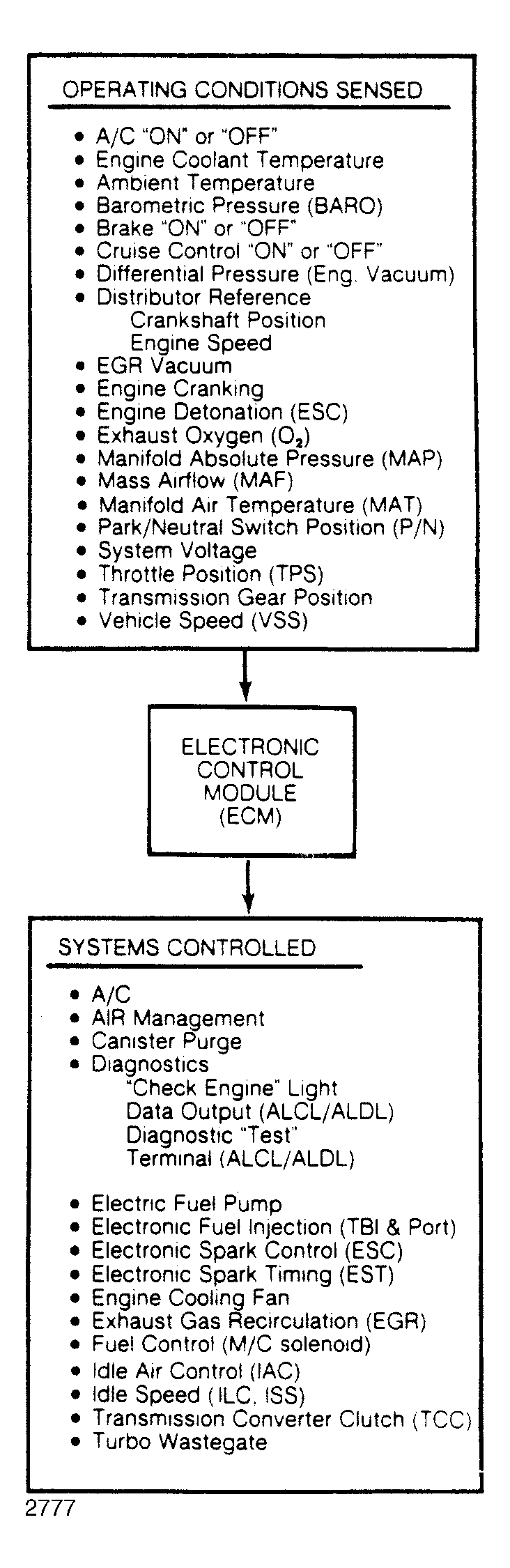 The computerized engine control system monitors as many as 19 engine/vehicle functions. See Fig 1 . This system controls engine operation and lowers exhaust emissions while maintaining fuel economy and driveability. The Electronic Control Module (ECM) is the "brain" of the CCC system.