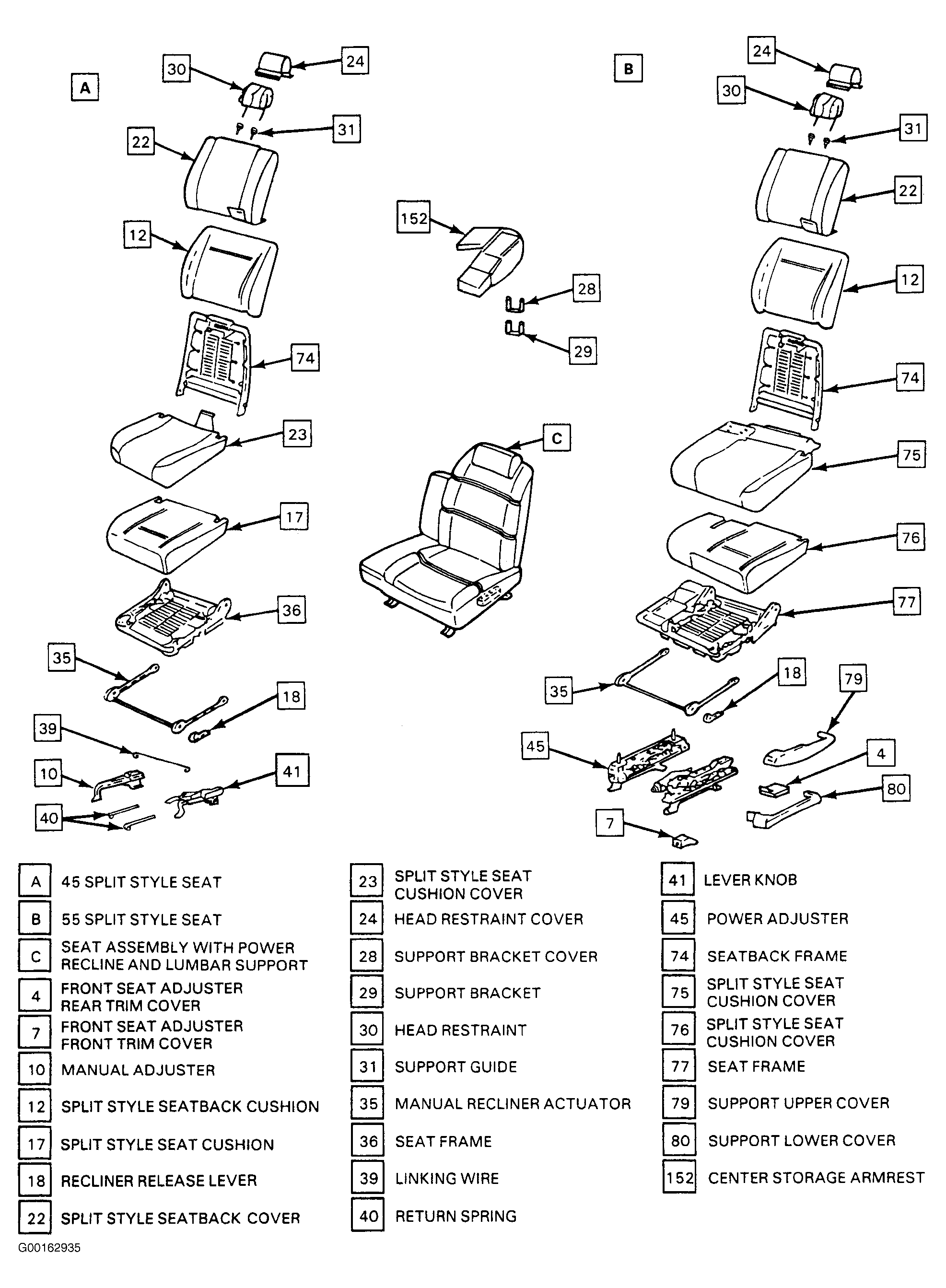 The front seats are a 55-45 split style with driver's side armrest. On some vehicles the armrest may also function as a storage compartment. Seat covers may be cloth or leather. Front seats are equipped with manual recliners and either manual or power adjusters. Front seats may also be equipped with power recliners and power lumbar supports. See Fig 1 .