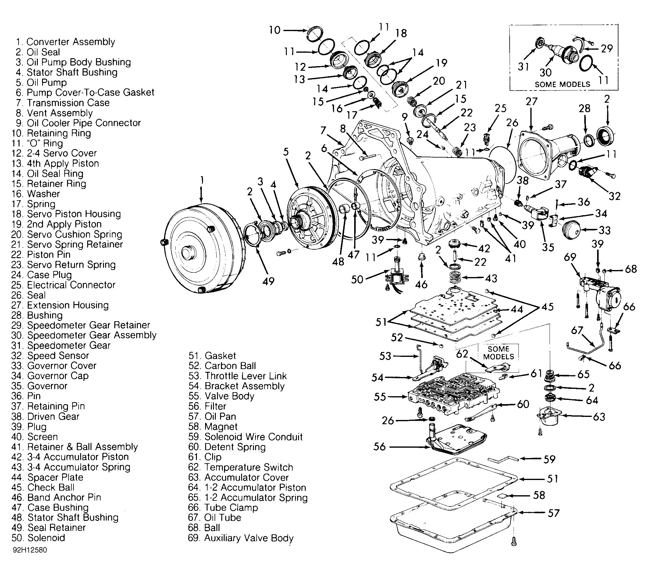 A hydraulic system, pressurized by a variable capacity vane type pump, provides pressure required to operate friction elements and automatic controls. Transmission contains an auxiliary valve body for smoother Drive and Reverse engagement. Temperature switch may be used to apply TCC to prevent transmission overheating. Temperature switch reduces fluid temperature in Overdrive when TCC is not applied.