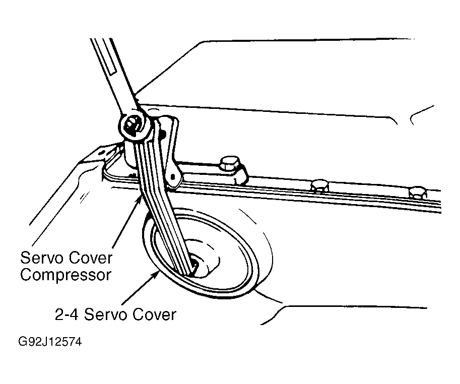 - Mount transmission in Holding Fixture (J-8763-02). Remove torque converter. Clean outside of transmission case if necessary. Install Servo Cover Compressor (J-29714) on 2 oil pan bolts. See Fig 1 . Compress servo cover. Remove retaining ring. Remove servo cover and "O" ring.