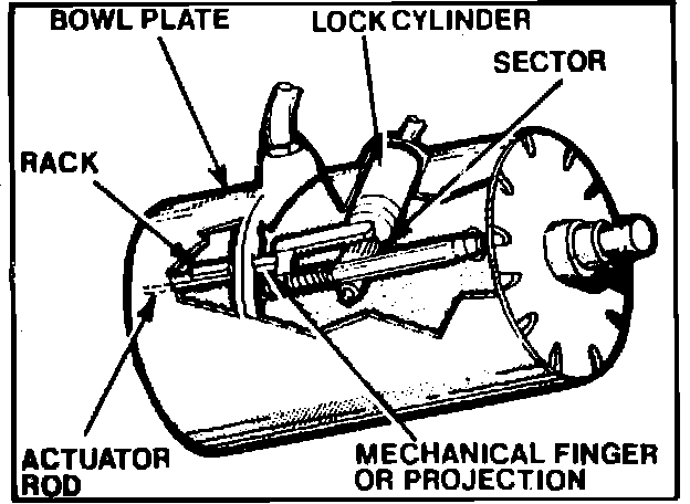 Actuation of the ignition switch is prevented by a mechanical lockout system, Figs. 3 and 4, which prevents the lock cylinder from rotating when the selector lever is out of Park or Neutral. When the selector lever is in Park or Neutral, the slots in the bowl plate and the finger on the actuator rod align, allowing the finger to pass through the bowl plate in turn actuating the ignition switch, Fig. 5. If the selector lever is in any position other than Park or Neutral, the finger contacts the bowl plate when the lock cylinder is rotated, thereby preventing full travel of the lock cylinder.
