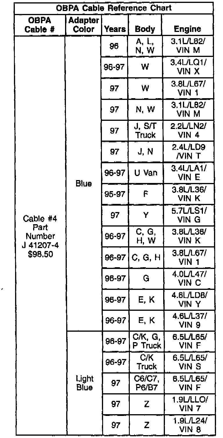 A modification to the OBPA is being offered by Kent-Moore to support these additional vehicles and to allow reprogramming using the Tech 2. The revisions to the OBPA for the Tech 2 is very important as the Tech 2 is the only tool used for service programming for 1997 and future vehicles. To have the modifications performed, contact Kent-Moore at (800) 345-2233. The revisions (part number J 41207 REV-C) are free of charge for GM dealerships/retailers.