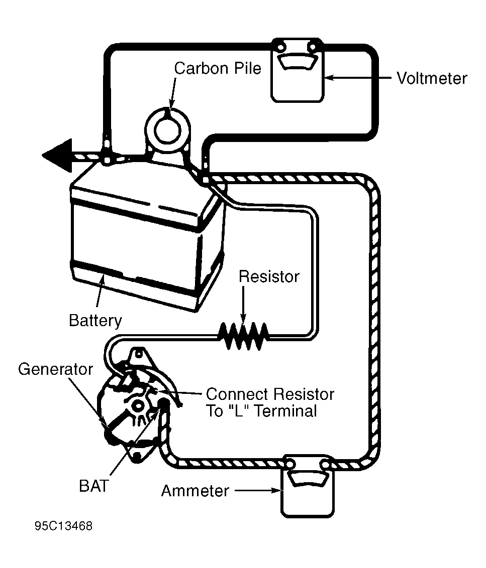 - Mount generator on test stand. Set test stand controls to turn generator clockwise. Ensure ground polarity of generator and battery are the same. Ensure battery is fully charged. Connect voltmeter, ammeter and carbon pile (in the OFF position). Connect a 30-500 ohm resistor between battery and terminal "L" of generator. See Fig 1.