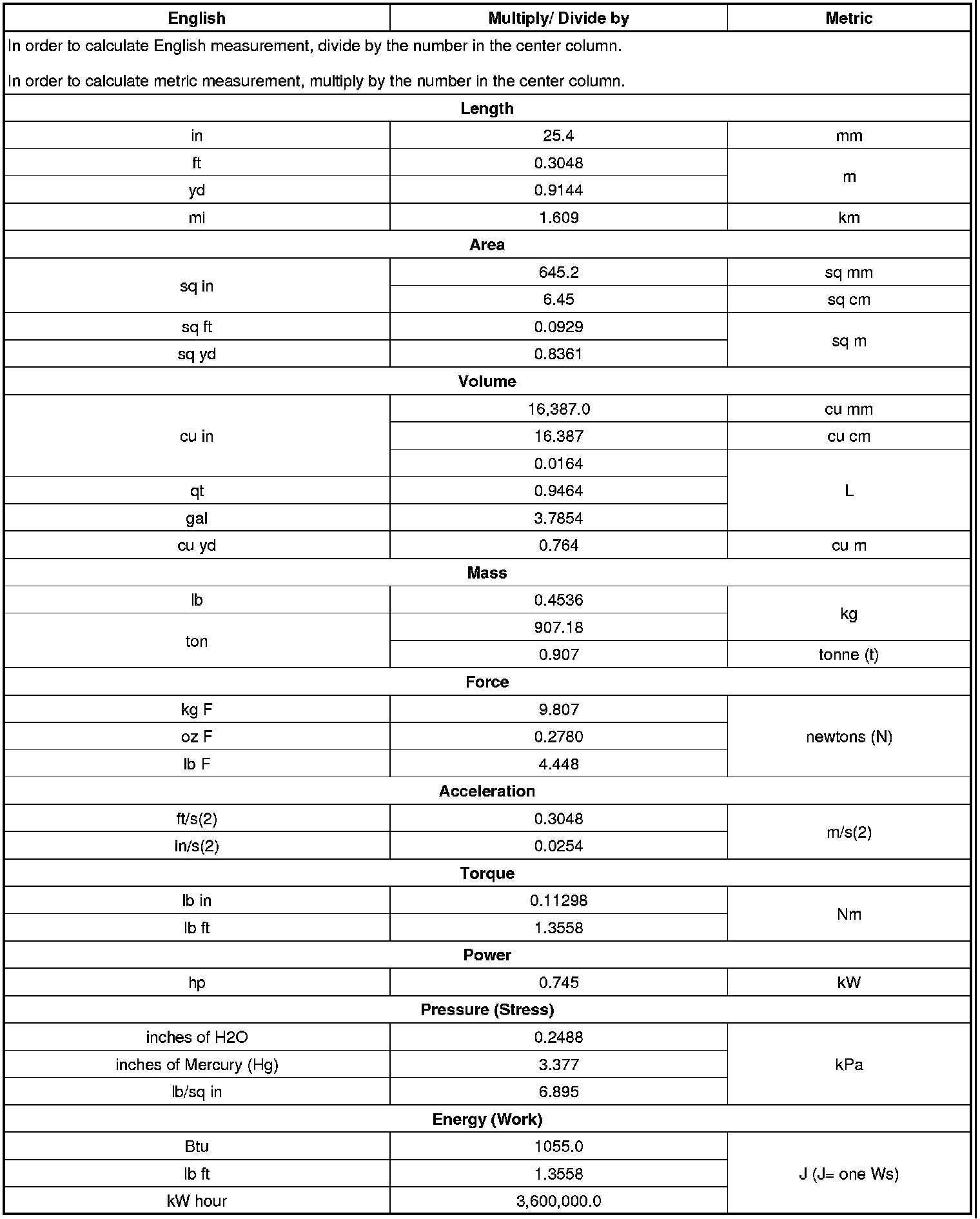 US English/Metric Conversion