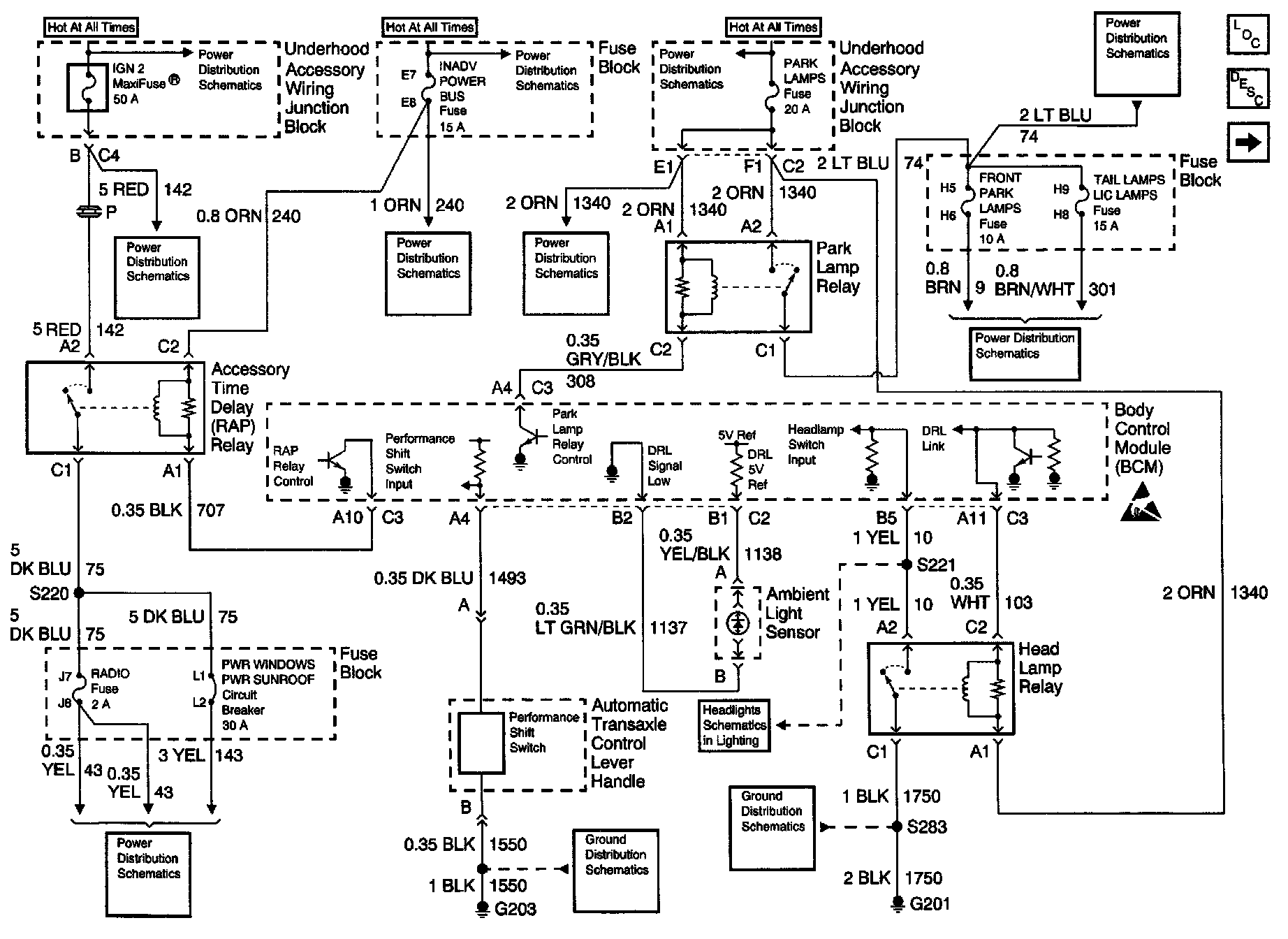 Body Control Module Schematics : Power, RAP Relay, Headlamp Relay, Park Lamp Relay And Ambient Light Sensor: