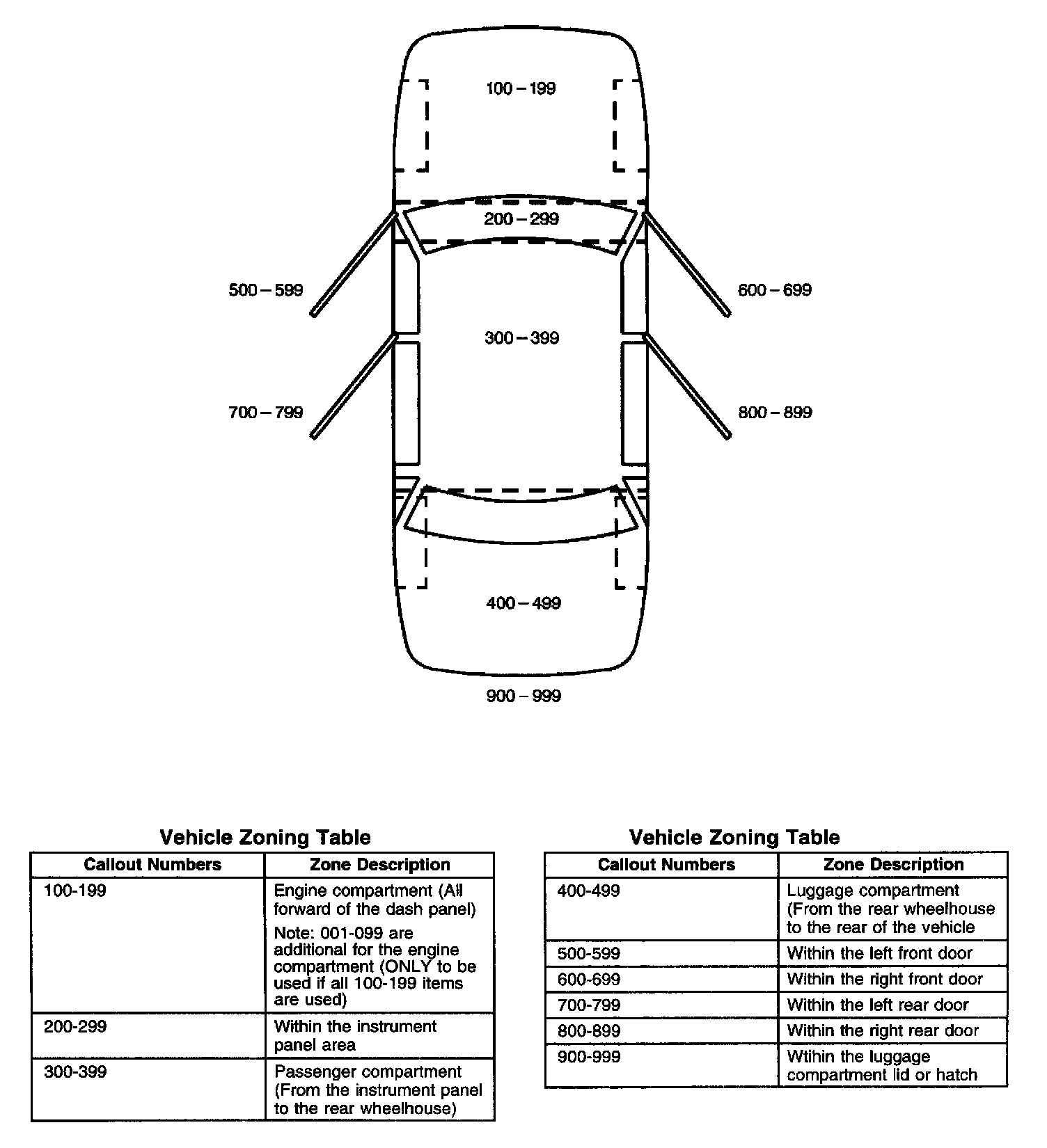 All grounds, in-line connectors, pass-through grommets, and splices have identifying numbers that correspond to where they are located in the vehicle. The following table explains the numbering system.