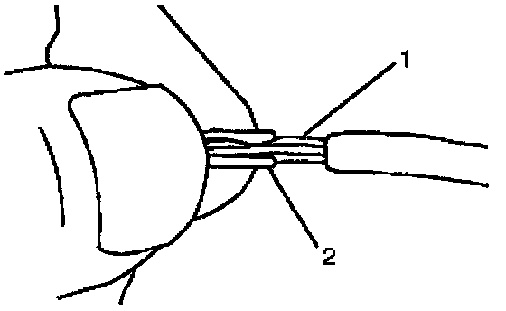 7. Center the splice clip (2) over the stripped wires (1) and hold the clip in place.