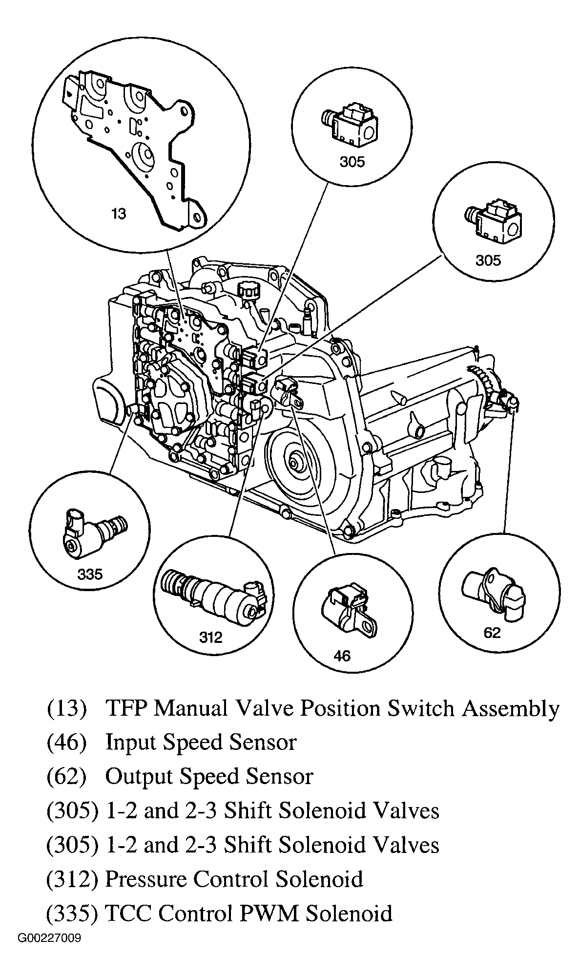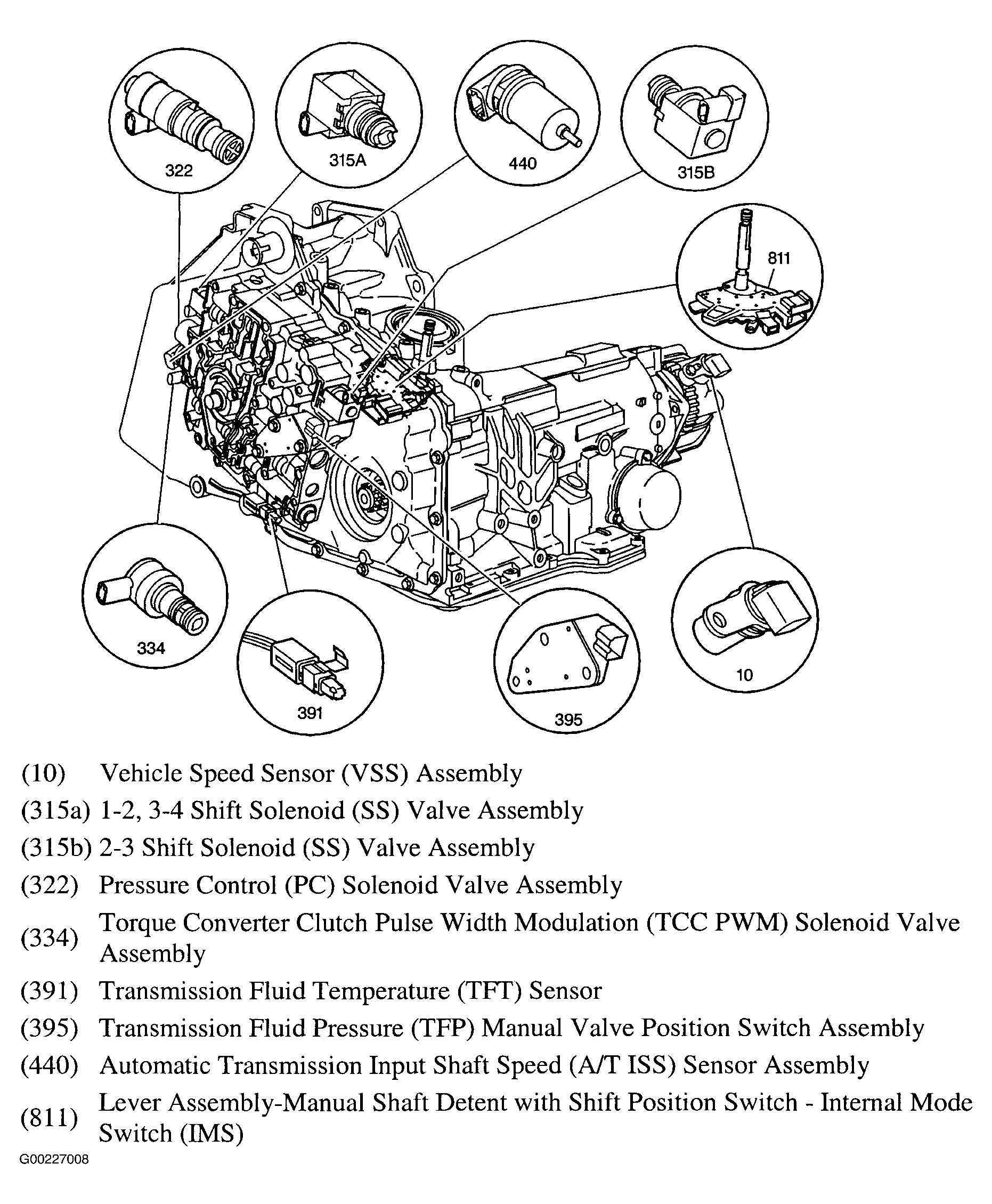 The Input Shaft Speed (ISS) sensor is a magnetic inductive pickup that relays turbine shaft speed information to the Powertrain Control Module (PCM). The PCM uses ISS sensor information in order to control line pressure, transmission shift patterns and TCC apply and release. This information is also used in order to calculate the appropriate operating gear ratios and TCC slippage. The AT ISS sensor mounts in the case cover, next to the automatic transmission input shaft speed sensor reluctor wheel assembly. See Figure or Figure . An air gap of 0.0032-0.0834" (0.08-2.12 mm) occurs between the sensor and the teeth on the speed sensor reluctor wheel as the drive sprocket rotates. The speed sensor reluctor wheel is secured to and turns with the drive sprocket by the tangs on the drive sprocket forward thrust washer.