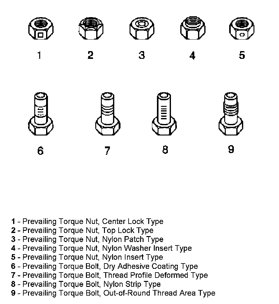 These fasteners accomplish the thread interface by the presence of a thread-locking compound on the fastener threads. Refer to the appropriate repair procedure in order to determine if the fastener may be reused and the applicable thread-locking compound to apply to the fastener.