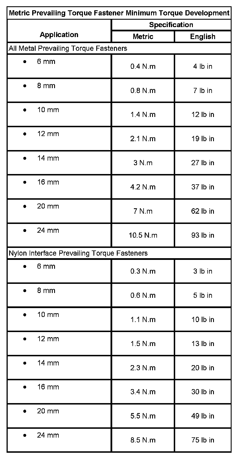 Metric Prevailing Torque Fastener Minimum Torque Development: