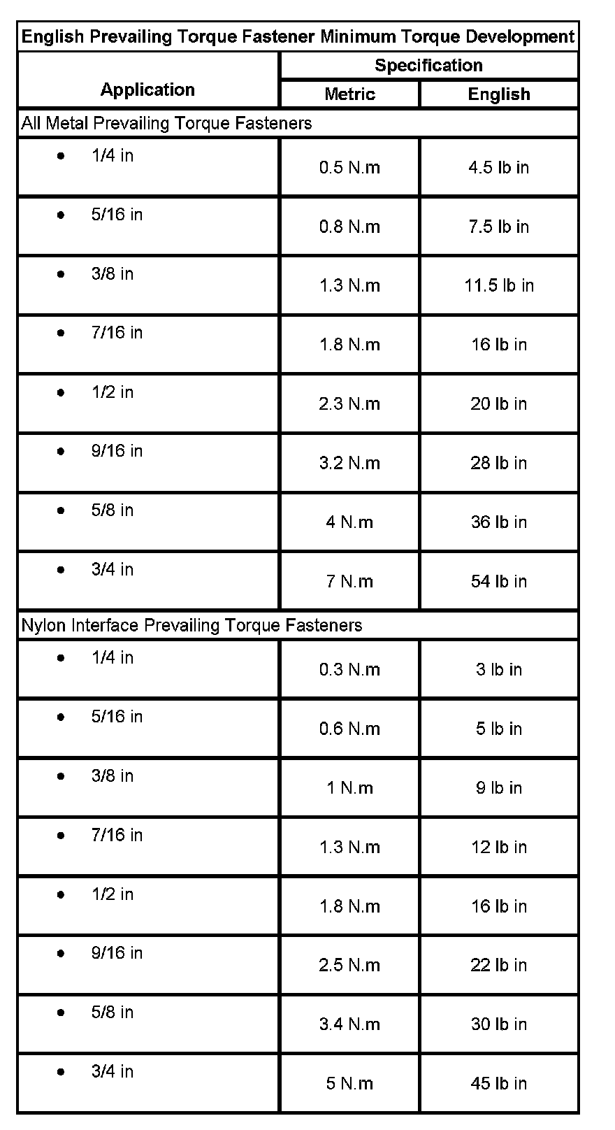 ENGLISH PREVAILING TORQUE FASTENER MINIMUM TORQUE DEVELOPMENT