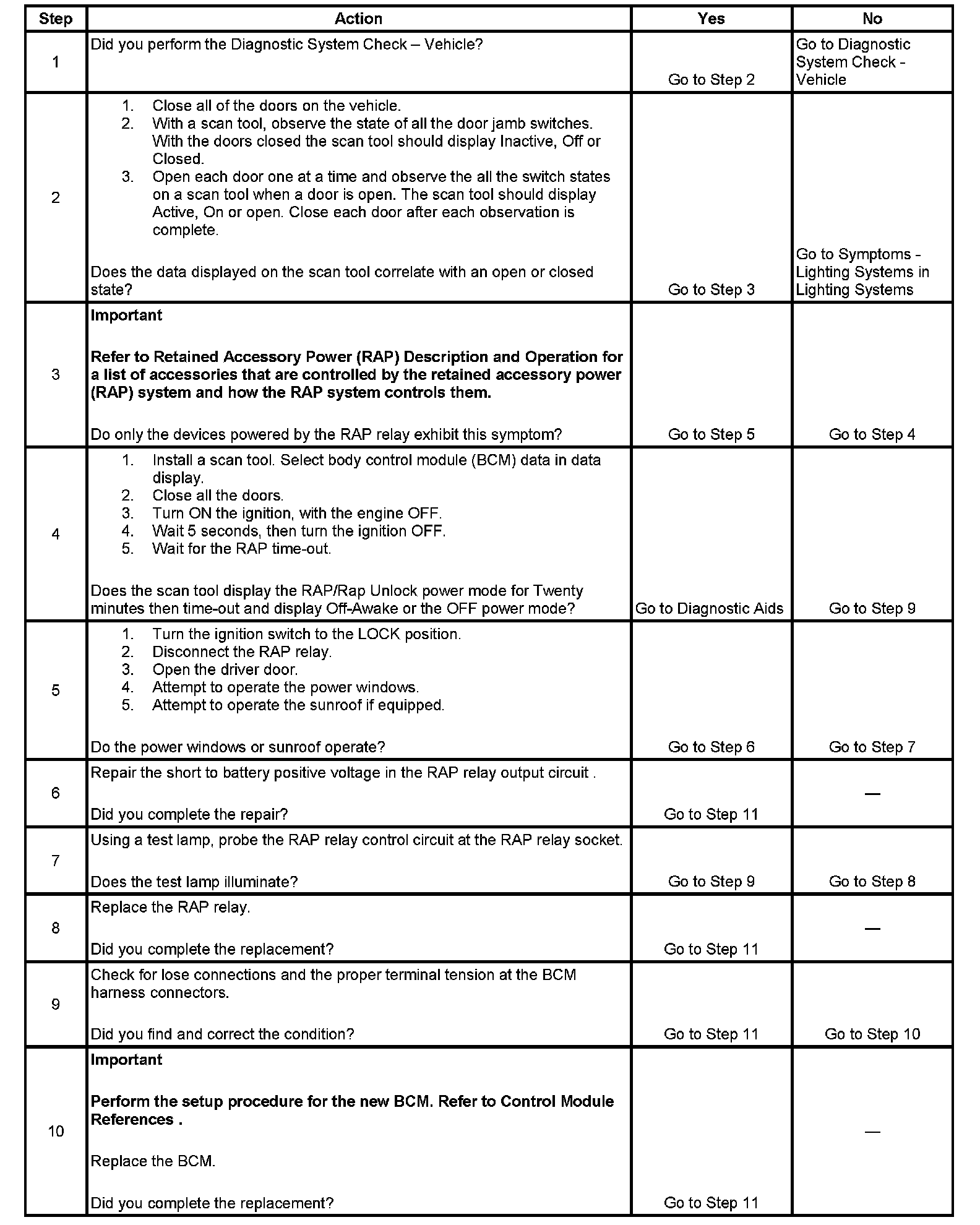 This table is used for all retained accessory power (RAP) relay and RAP serial data controlled accessories which remain active after RAP has timed out. The RAP relay system can malfunction separately from the serial data controlled RAP system and the serial data controlled RAP system can malfunction separately from the RAP relay. If multiple accessories are not exhibiting an "On After Time-out" symptom, either on the RAP relay controlled circuit or the serial data controlled circuit or both, the malfunction is in a particular device and not in the RAP control system. Refer to Control Module References to locate information on a specific system.