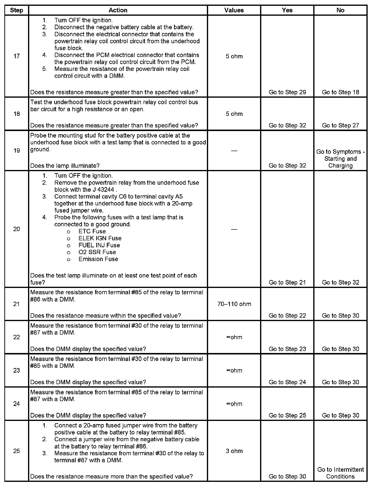 The powertrain relay system diagnosis table assumes that the vehicle battery is fully charged.