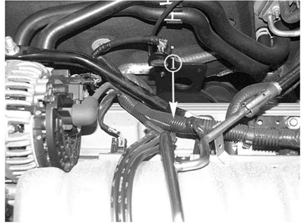 Observe the PCM harness (1) touching the plug wires. Remove the generator rear brace.