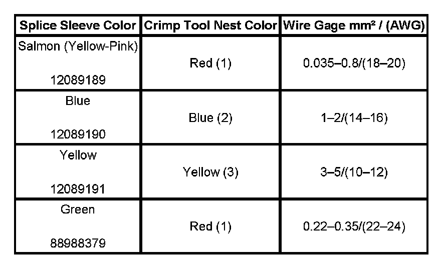 5. Use the Splice Crimp Tool from the J-38125 to crimp duraseal splice sleeve. In order to position the duraseal splice sleeve in the proper color nest of the Splice Crimp Tool, refer to the table at the beginning of this repair procedure.