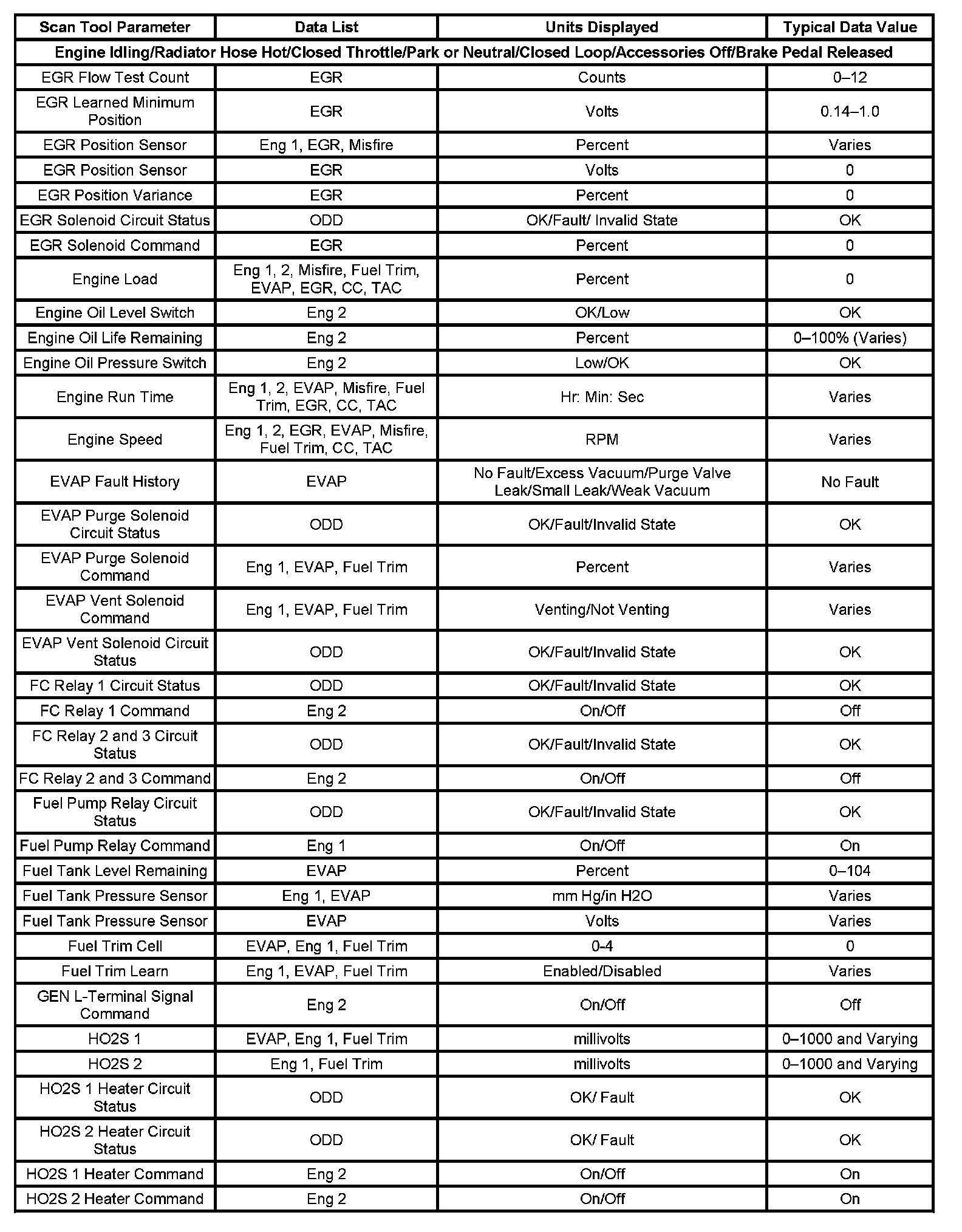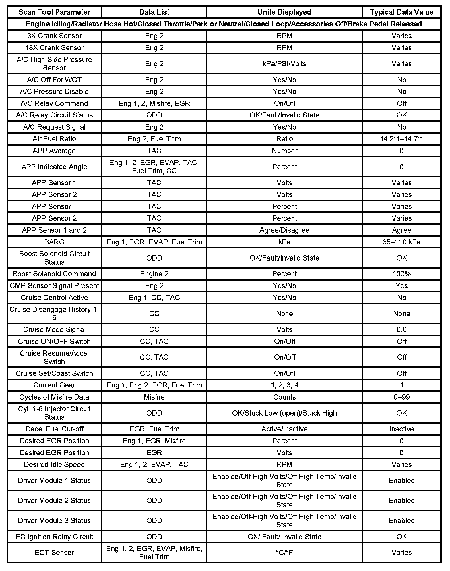 The Engine Scan Tool Data List contains all engine-related parameters that are available on the scan tool. The list is arranged in alphabetical order. A given parameter may appear in any one of the data lists, and in some cases may appear more than once, or in more than one data list in order to group certain related parameters together.
