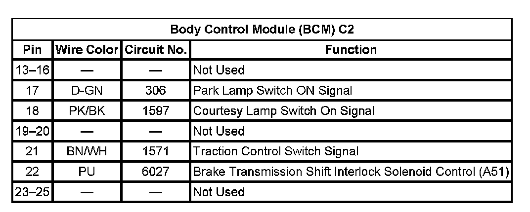 Body Control Module (BCM) C2 (Pin 13 - Pin 25):