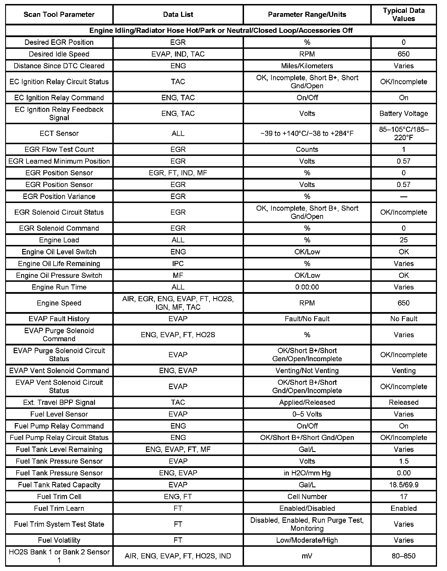 The Engine Scan Tool Data List contains all engine related parameters that are available on the scan tool. The list is arranged in alphabetical order. A parameter may appear in any one of the data lists, and in some cases may appear more than once, or in more than one data list in order to group certain related parameters together.