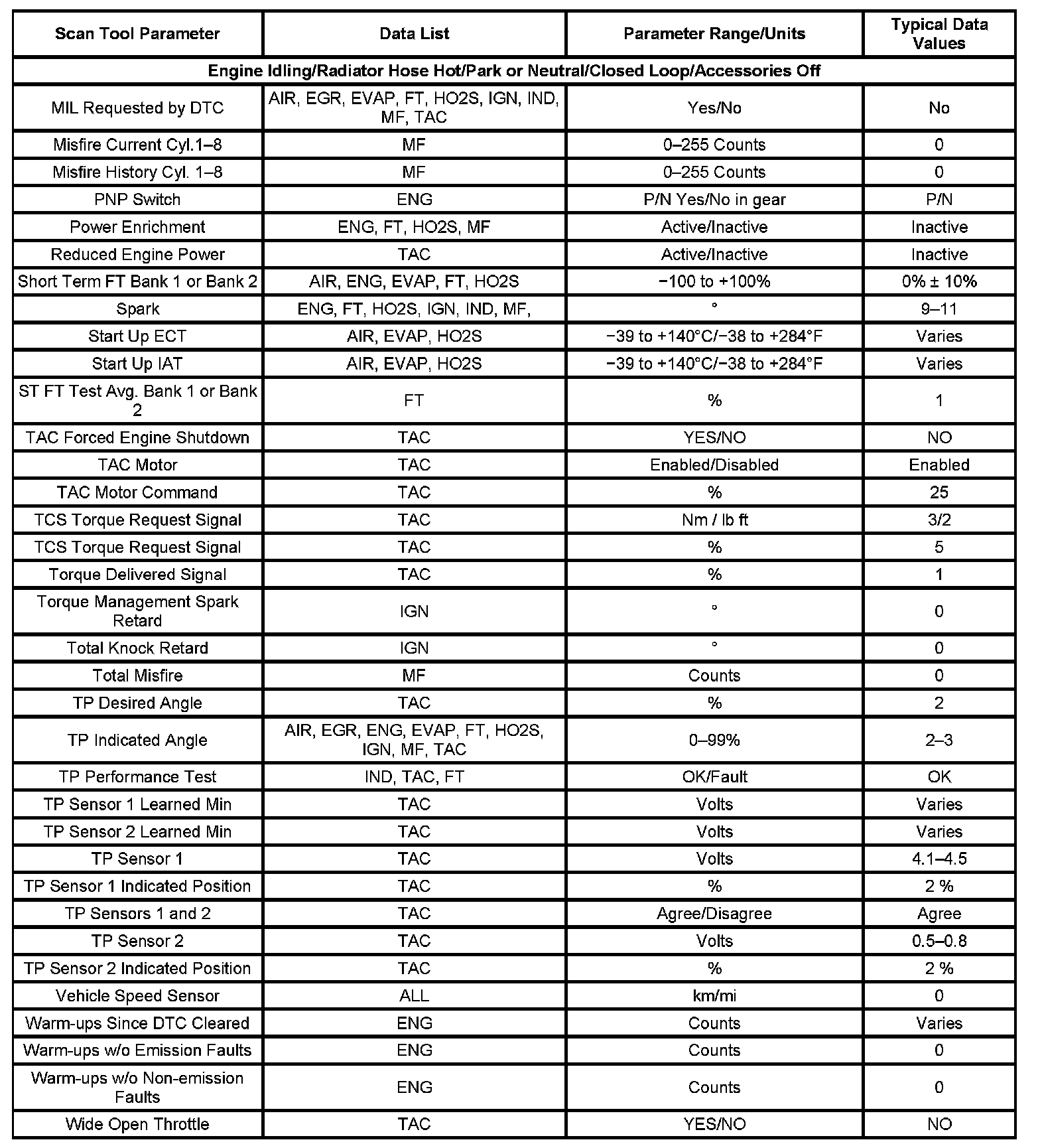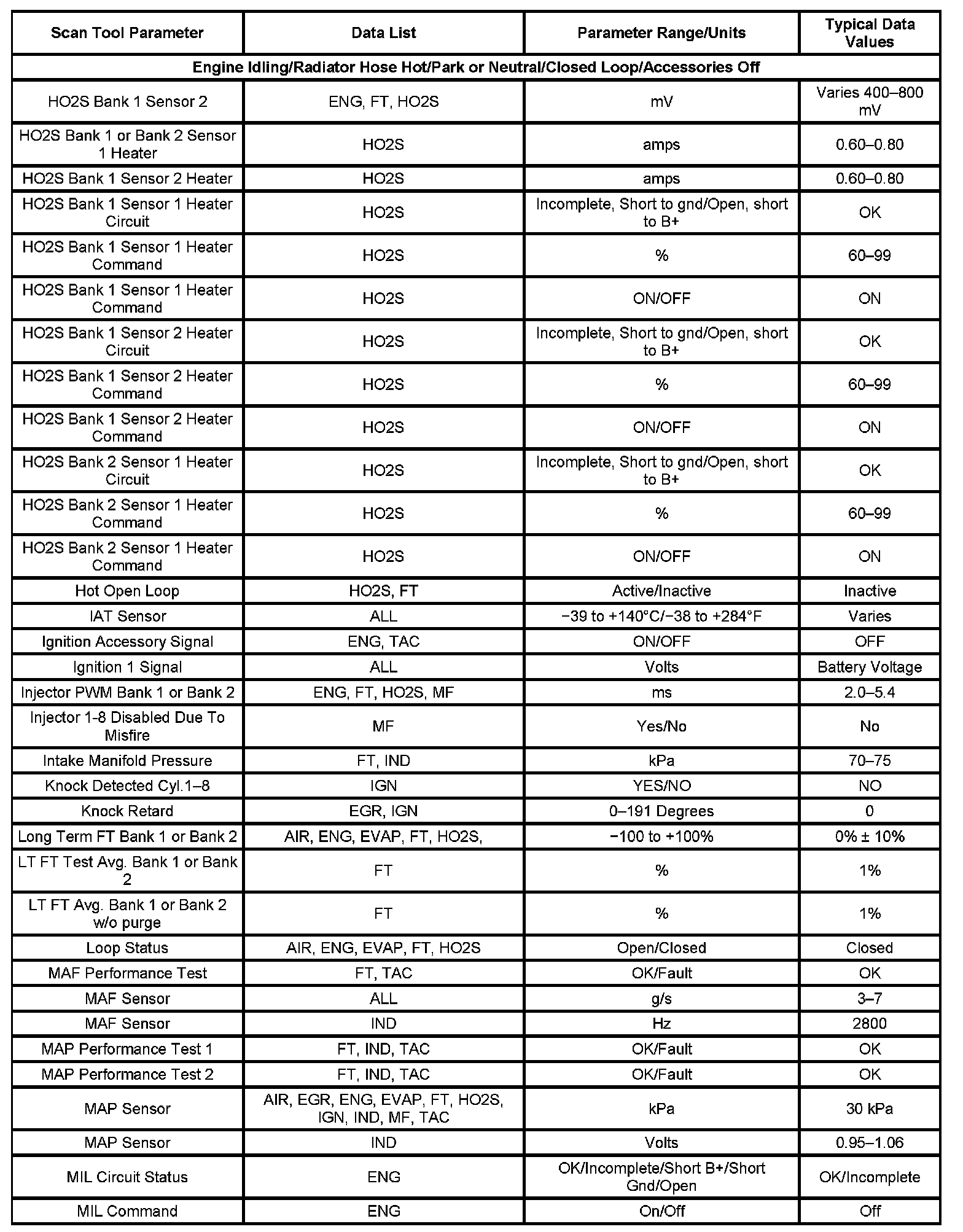 Scan tool values from a properly running engine may be used for comparison with the engine you are diagnosing. The Engine Scan Tool Data List represents the values that would be seen on a normal running engine.