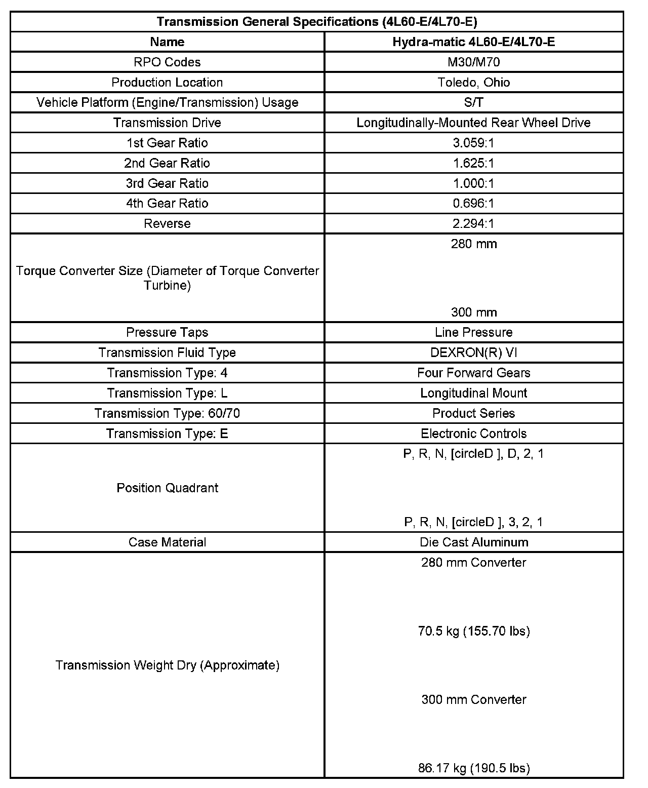 Transmission General Specifications: