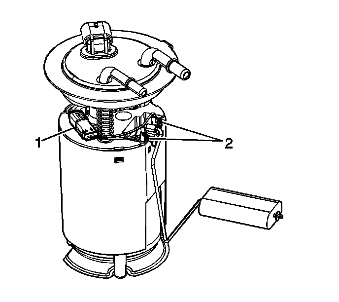 3. Depress the fuel level sensor retaining tabs (2) to release the sensor from the sender assembly.