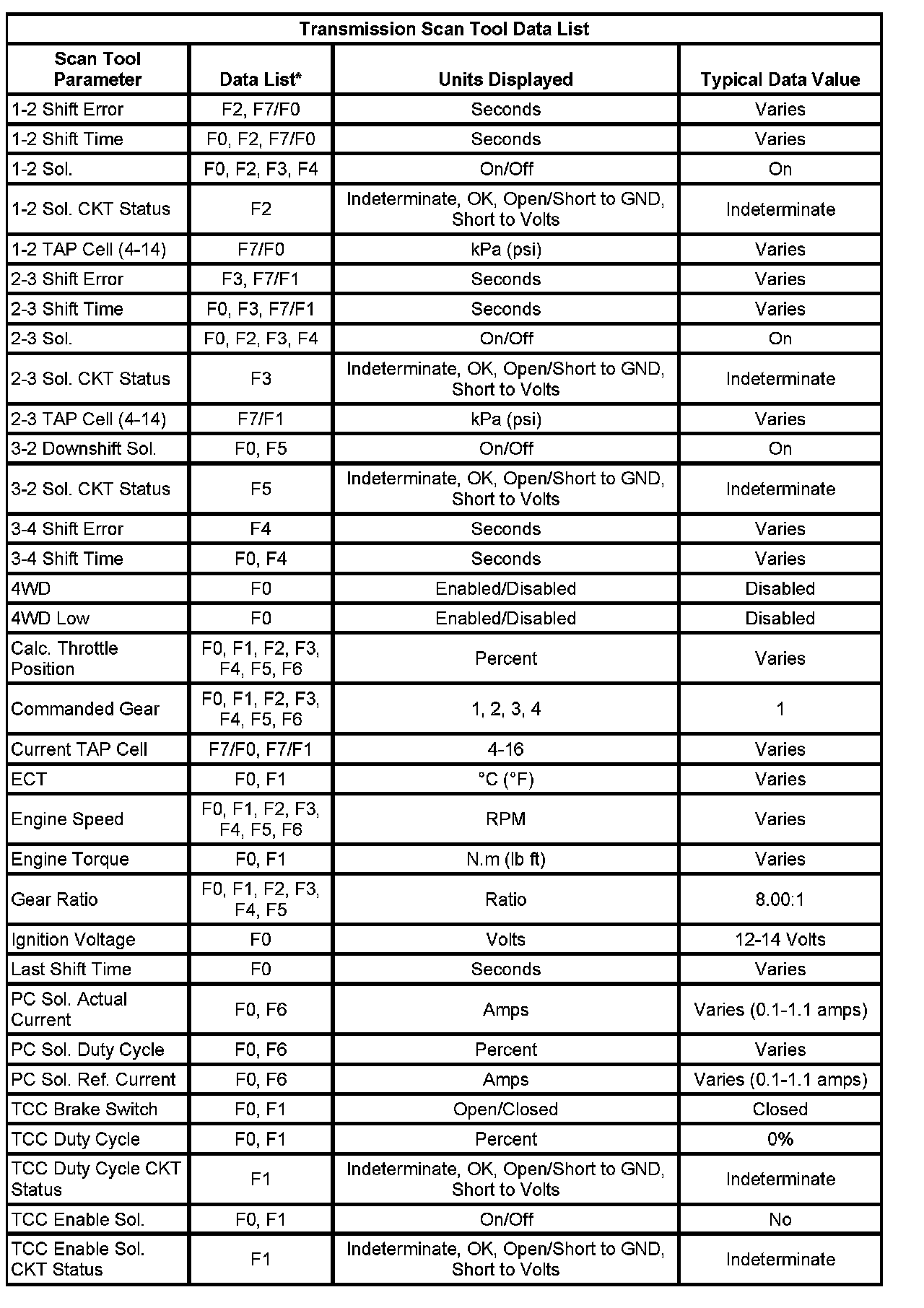 Only the parameters listed below are used in this manual for diagnosing. If a scan tool displays other parameters, the values are not recommended by General Motors for use in diagnosis