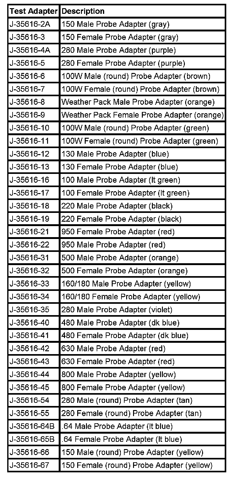 Important: When probing female 0.64 terminals, it is important to use the correct adapter. There have been some revisions to the test adapter for 0.64 terminals. The proper adapter for 0.64 terminals is the J 35616-64A which has a tin terminal and a blue wire between the base and tip. Failure to use the proper test adapter may result in damage to the terminal being tested and improper diagnosis.