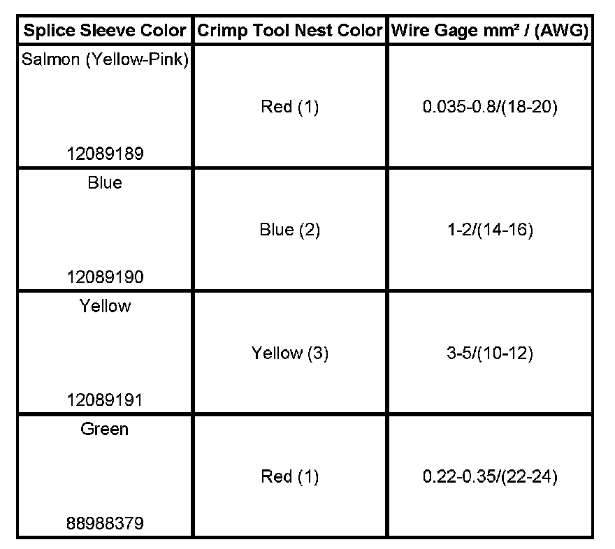 4. Select the proper DuraSeal splice sleeve according to the wire size. Refer to the above table at the beginning of the repair procedure for the color coding of the DuraSeal splice sleeves and the crimp tool nests.