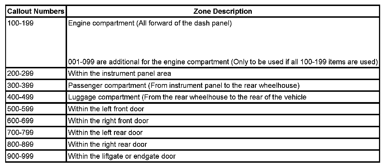 All grounds, in-line connectors, pass-through grommets, and splices have identifying numbers that correspond to where they are located in the vehicle. The table explains the numbering system.
