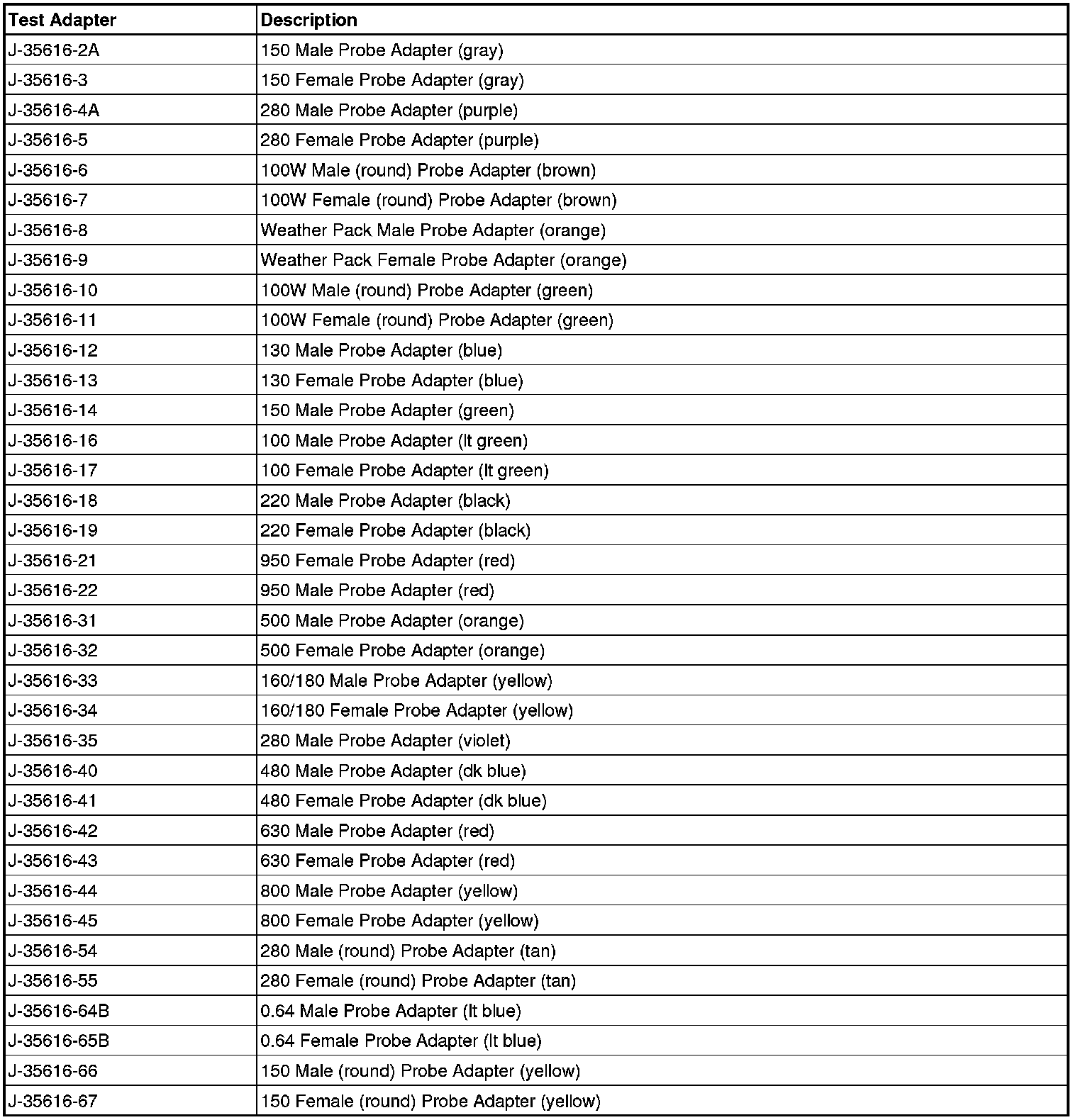 Important: When probing female 0.64 terminals, it is important to use the correct adapter. There have been some revisions to the test adapter for 0.64 terminals. The proper adapter for 0.64 terminals is the J 35616-64B which has a gold terminal and a black wire between the base and tip. Failure to use the proper test adapter may result in damage to the terminal being tested and improper diagnosis.