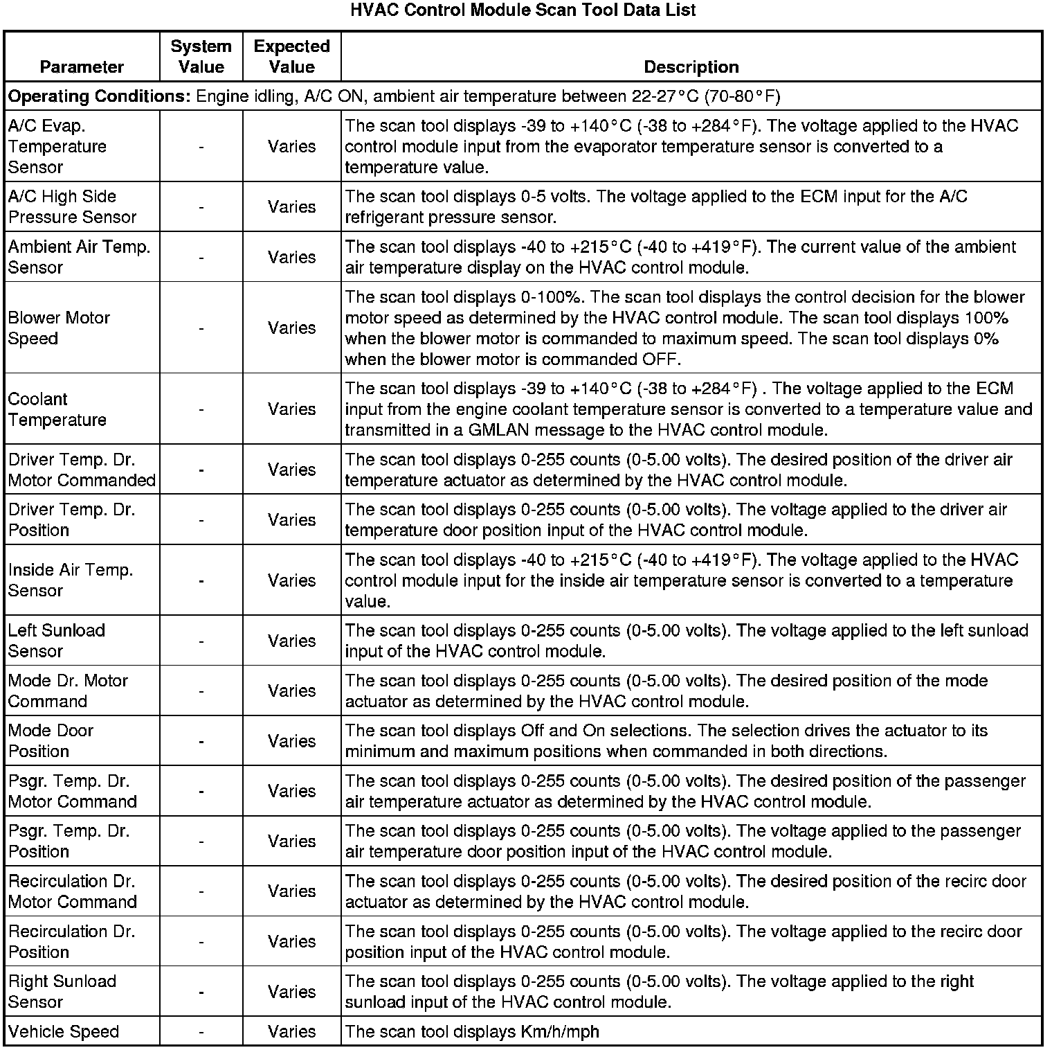 Heating, Ventilation and Air Conditioning Control Module Scan Tool Information