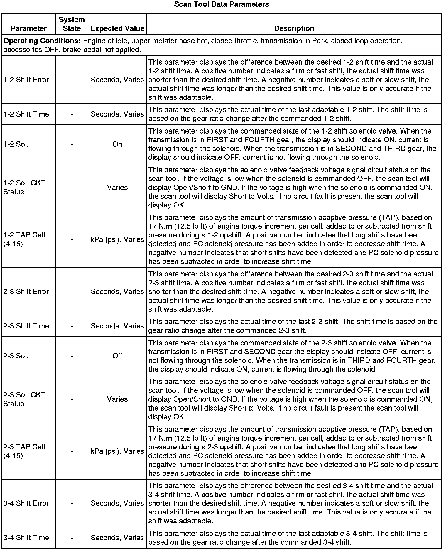 The scan tool values from a properly functioning transmission may be used for comparison with the transmission you are diagnosing. The values below represent a typical display recorded from a properly functioning system.