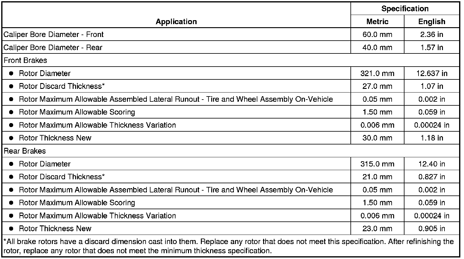 Disc Brake Component Specifications