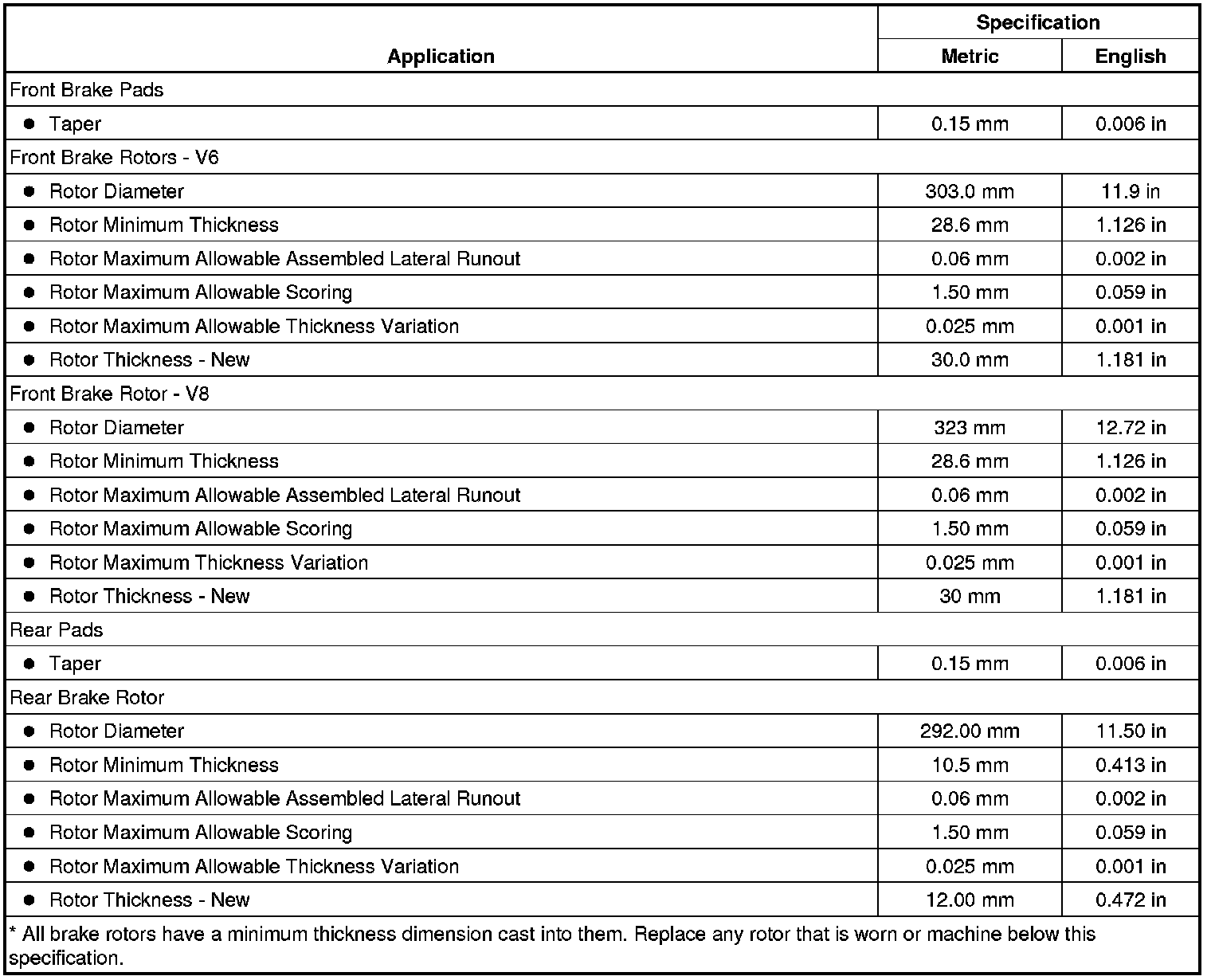 Disc Brake Component Specifications