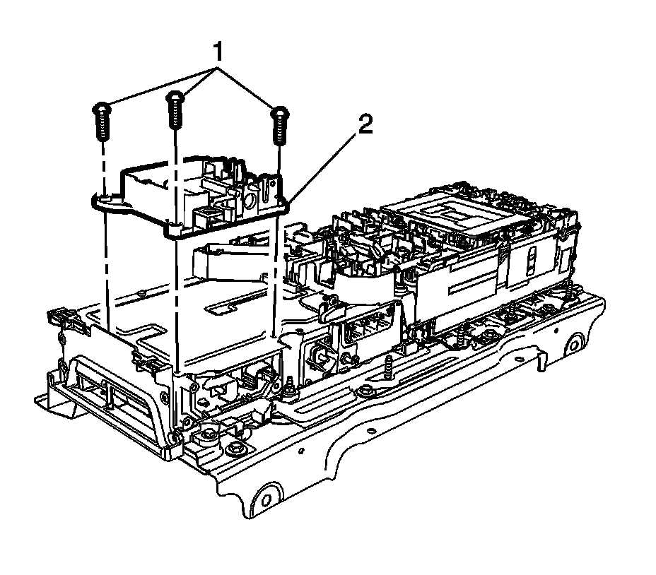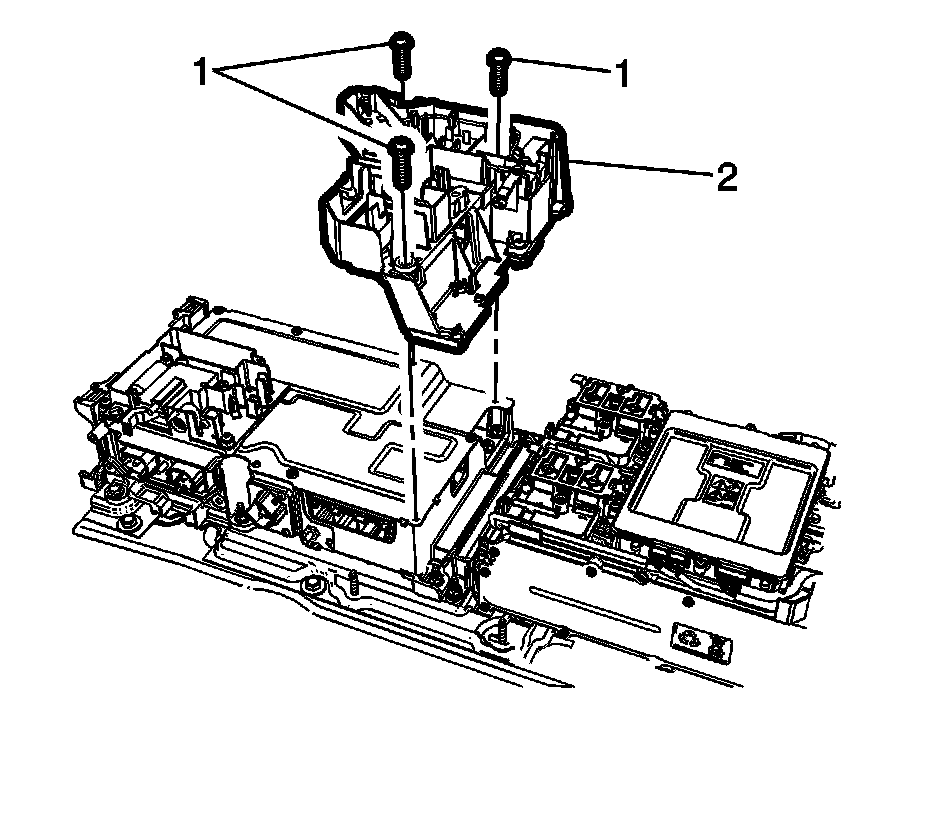 5. Remove the BDU2 mounting fasteners (1) and the BDU2 (2) from the top of the generator control module.