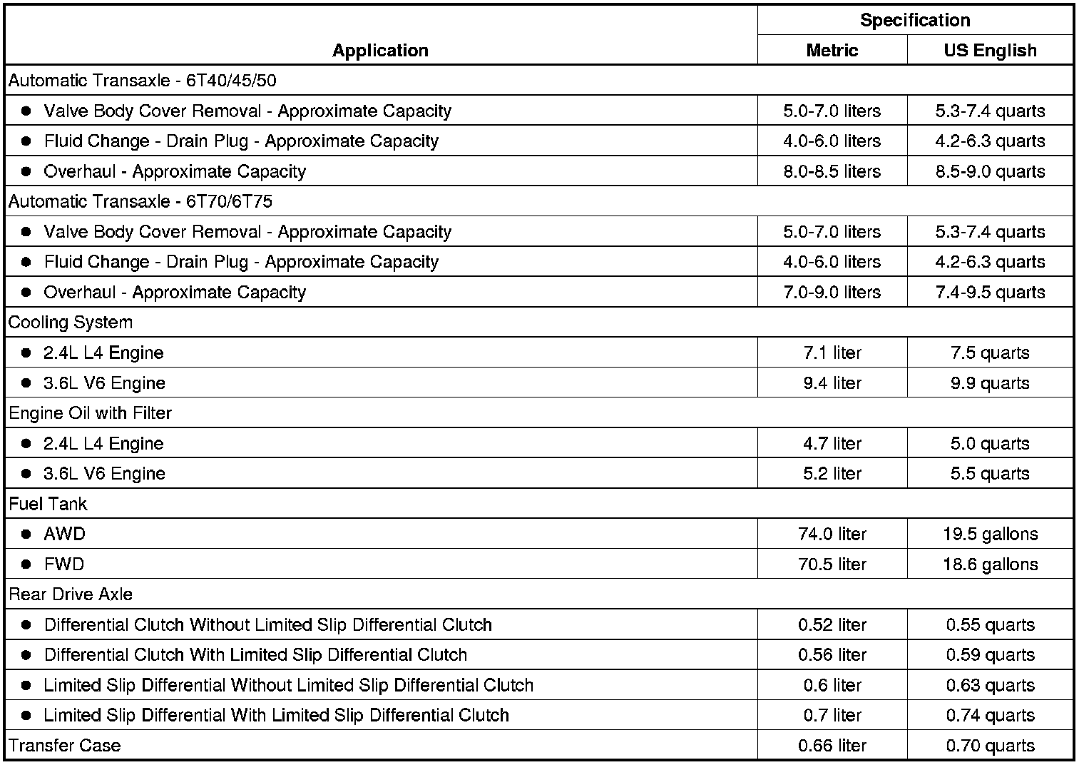 The following approximate capacities are given in US English and metric conversions. See Fluid and Lubricant Recommendations (Maintenance) for more information. All capacities are approximate. When adding, be sure to fill to the approximate level, as recommended in this manual. Recheck fluid level after filling.