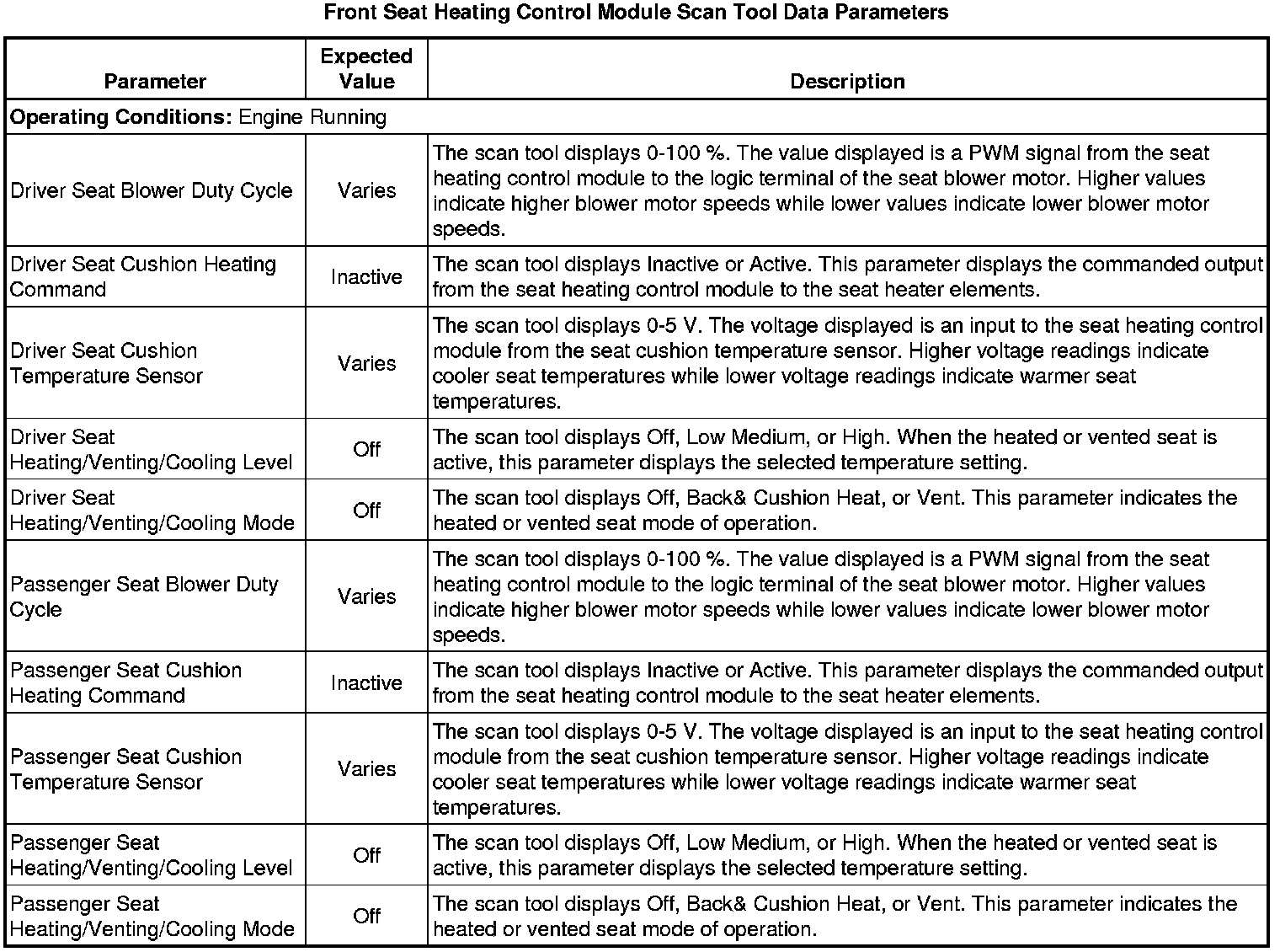 Driver Seat and Passenger Seat Heater Control Module Scan Tool Information